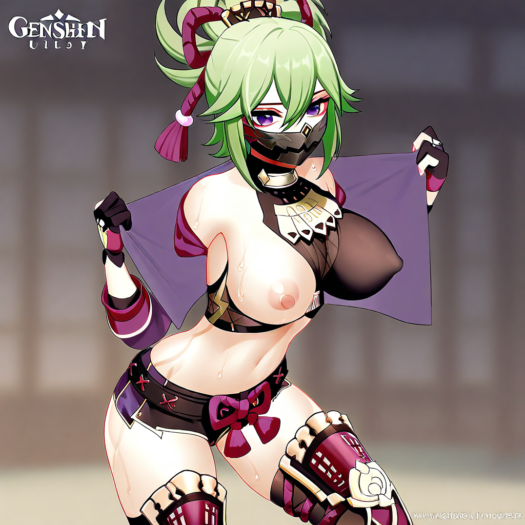 (Genshin_Kuki, green hair, ponytail, hair between eyes, hair ornament, bangs, purple eyes, gloves, short shorts, crop top, thighhighs, partially fingerless gloves, jacket, ninja mask),
