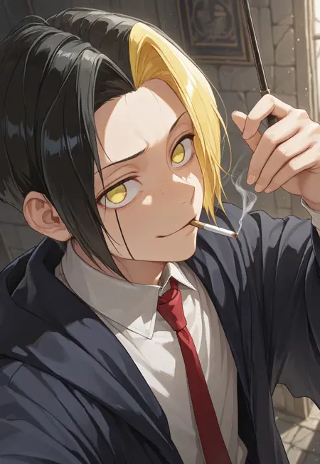 Suggested Character Tags: 1boy, solo, male focus, facial tattoo, black hair, blonde hair, split-color hair, yellow eyes, no pupils, cloak, collared shirt, necktie, belt, pants, shoes, wand, freckles