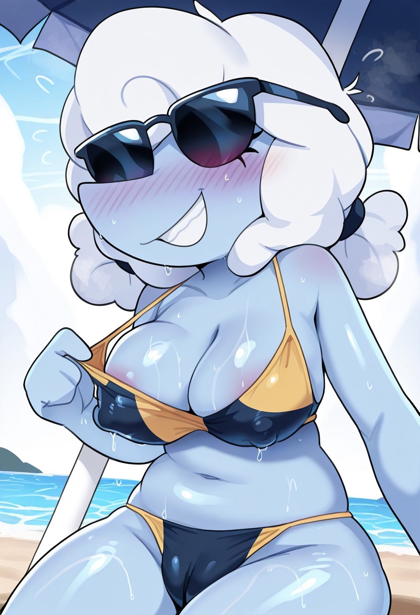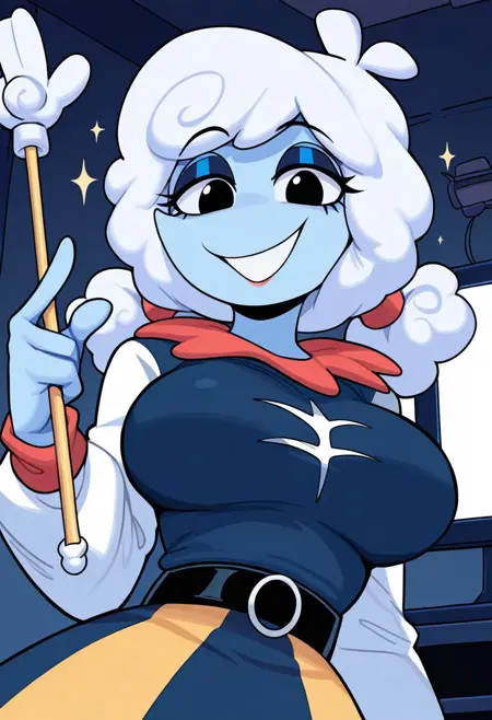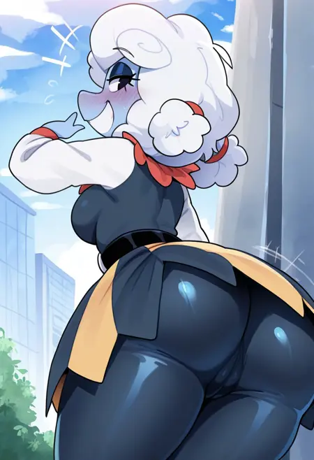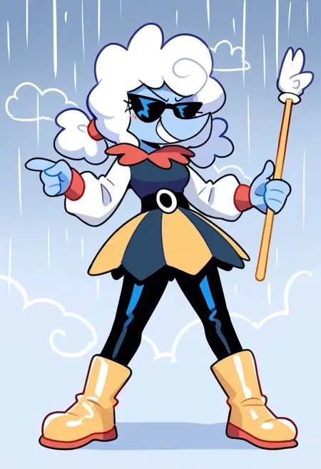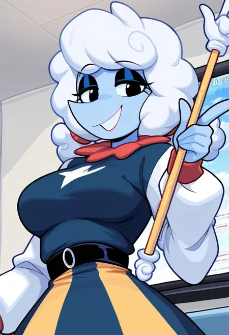 elninai, anthro, blue body, white hair, fluffy hair, twintails, cloud, eyelashes, eyeshadow, red neck ruff, blue shirt, white sleeves, belt, blue and yellow skirt, leggings, yellow boots,