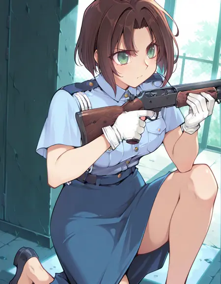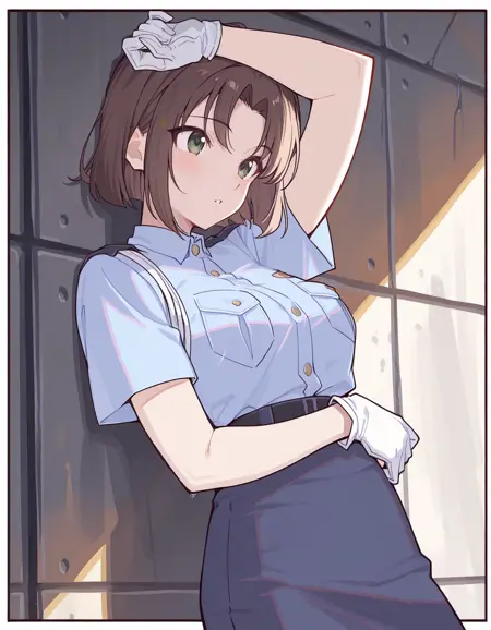 Police uniform, blue shirt, breast pocket, short sleeves, White gloves, blue skirt,