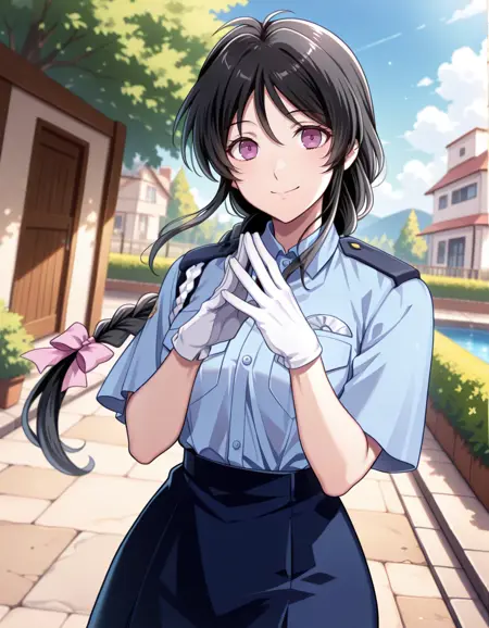 警察の制服、青シャツ、胸ポケット、短袖、白手袋、青スカート、