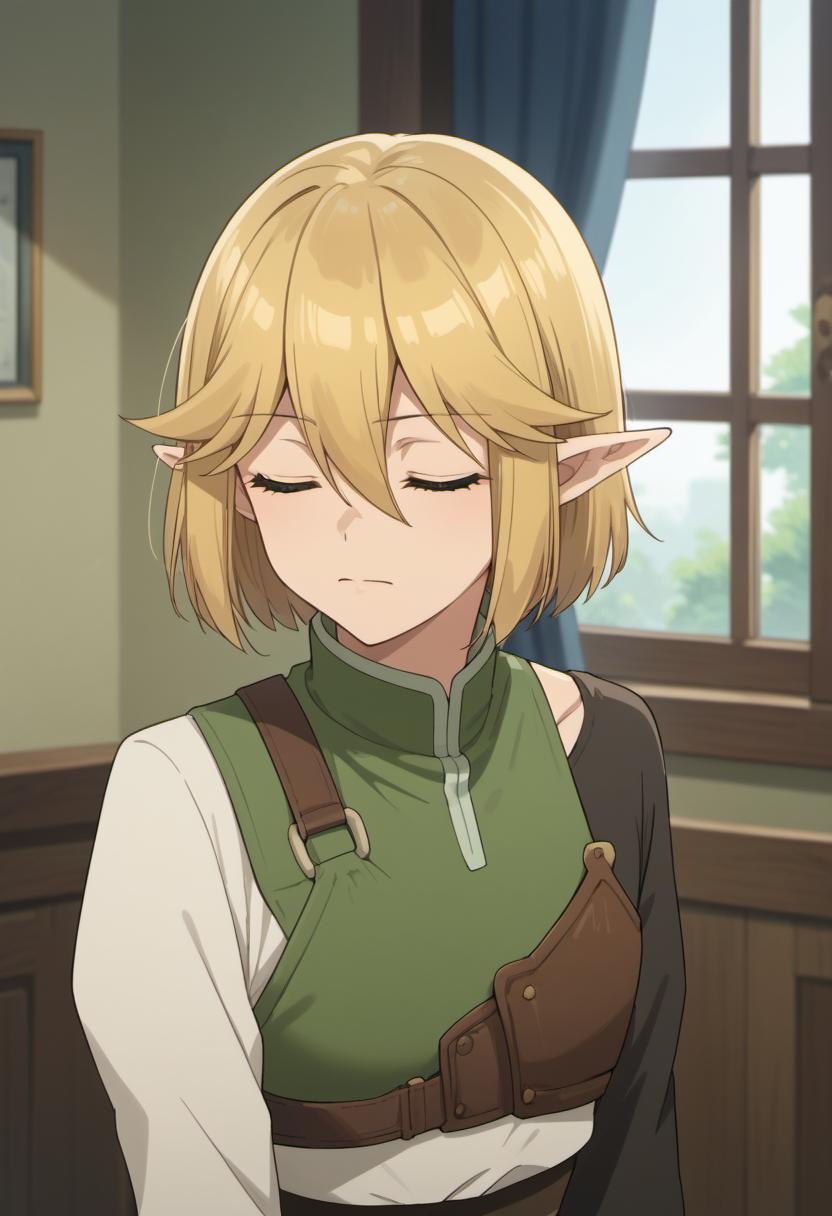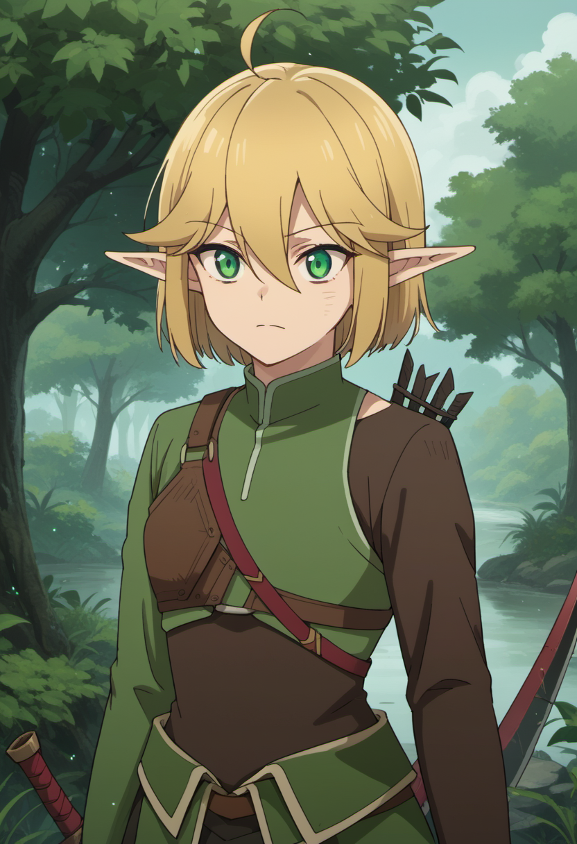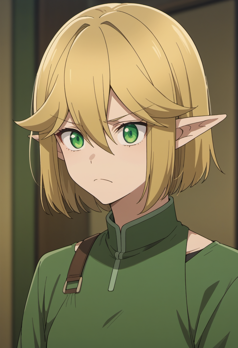 Trigger Words: fio, blonde hair, pointy ears, short hair, green eyes