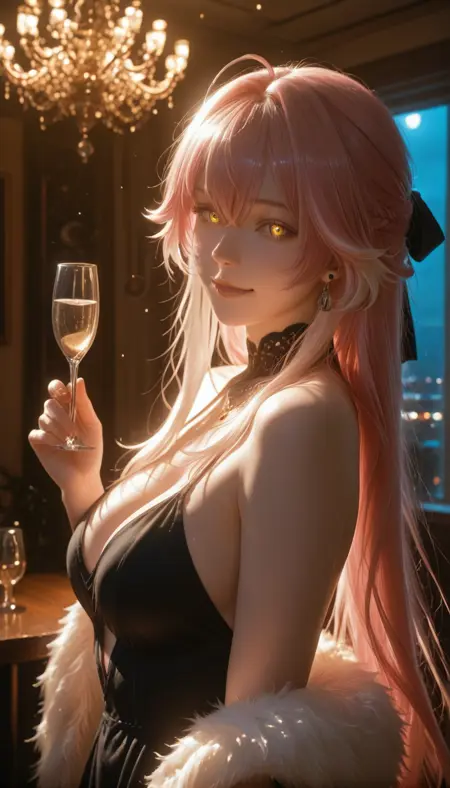 WWChangLi, long hair, breasts, large breasts, hair ornament, hair between eyes, yellow eyes, white hair, pink hair, braid, ponytail, multicolored hair, orange eyes, gradient hair, ahoge, hair ribbon, black ribbon, ponytail, earrings, hair intakes, very long hair,