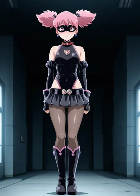プロンプト: pop step、ピンクの髪、正義の味方、正義の味方の衣装、スクリーンキャップ、短いツインテール、 hip にバットウイング、ミニスカート、