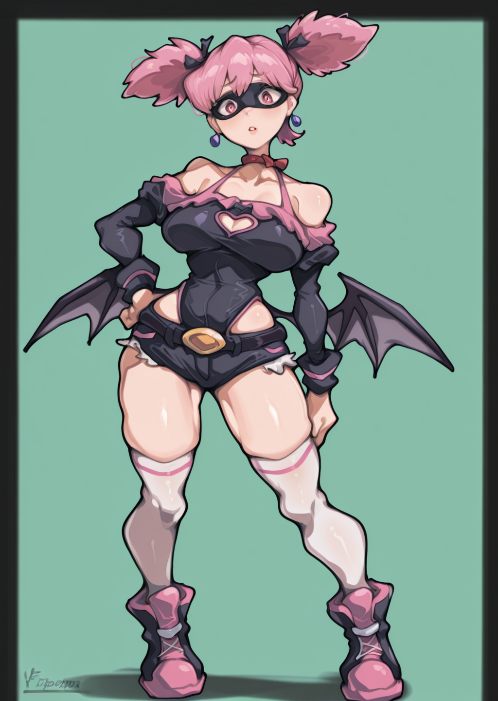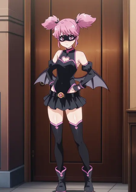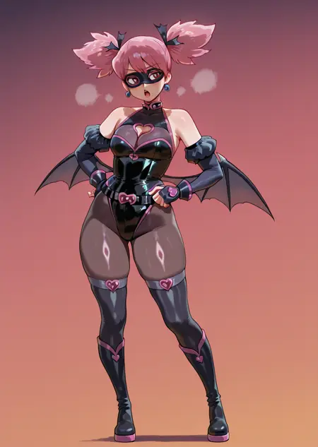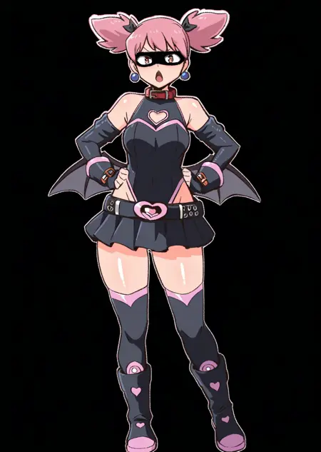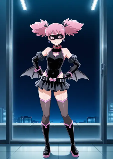 Prompts: pop step, pink hair, vigilante, vigilante outfit, screen cap, short twintails, bat wings on hips, mini skirt,