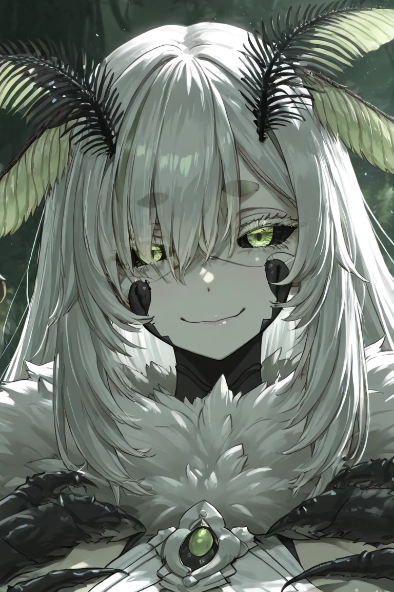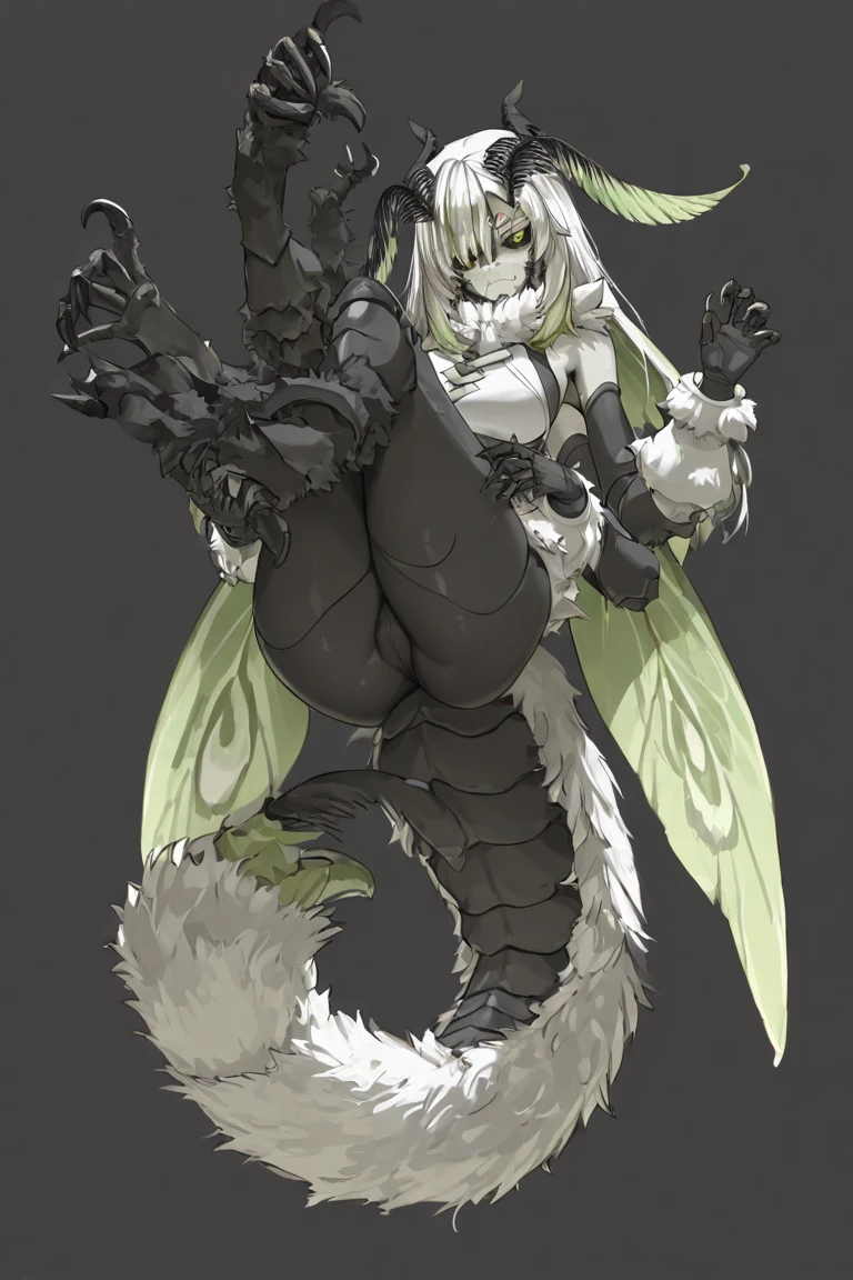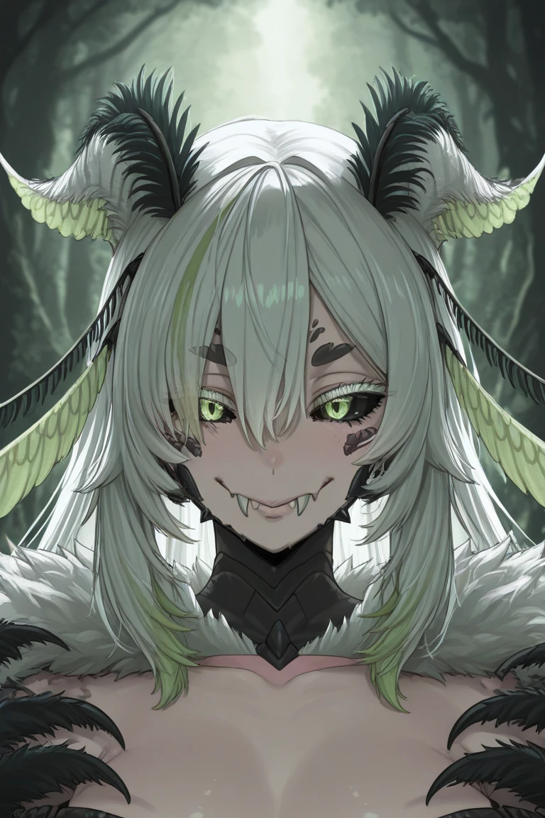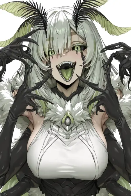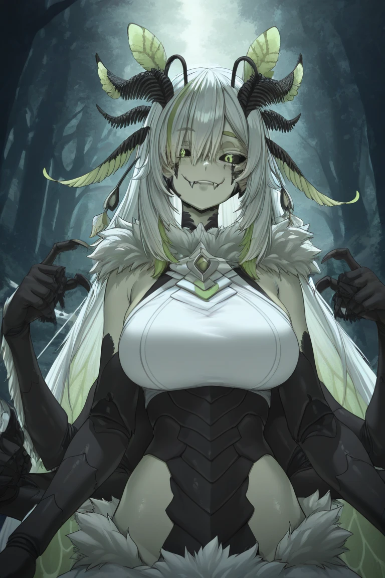 1girl, Juniper Actias, virtual youtuber, moth girl, black sclera, green eyes, colored sclera, antennae, fangs, multicolored hair, green hair, white hair, streaked hair, extra arms, colored skin, monster girl, arthropod girl