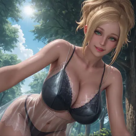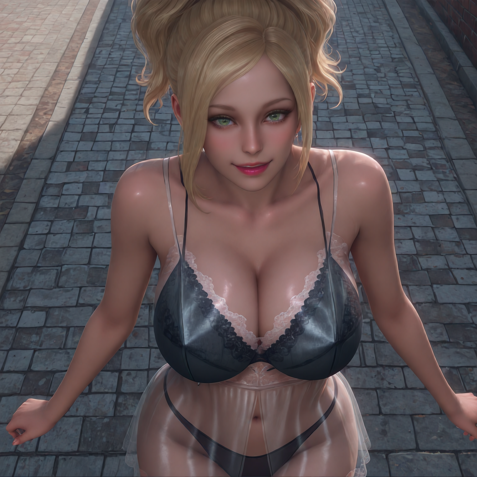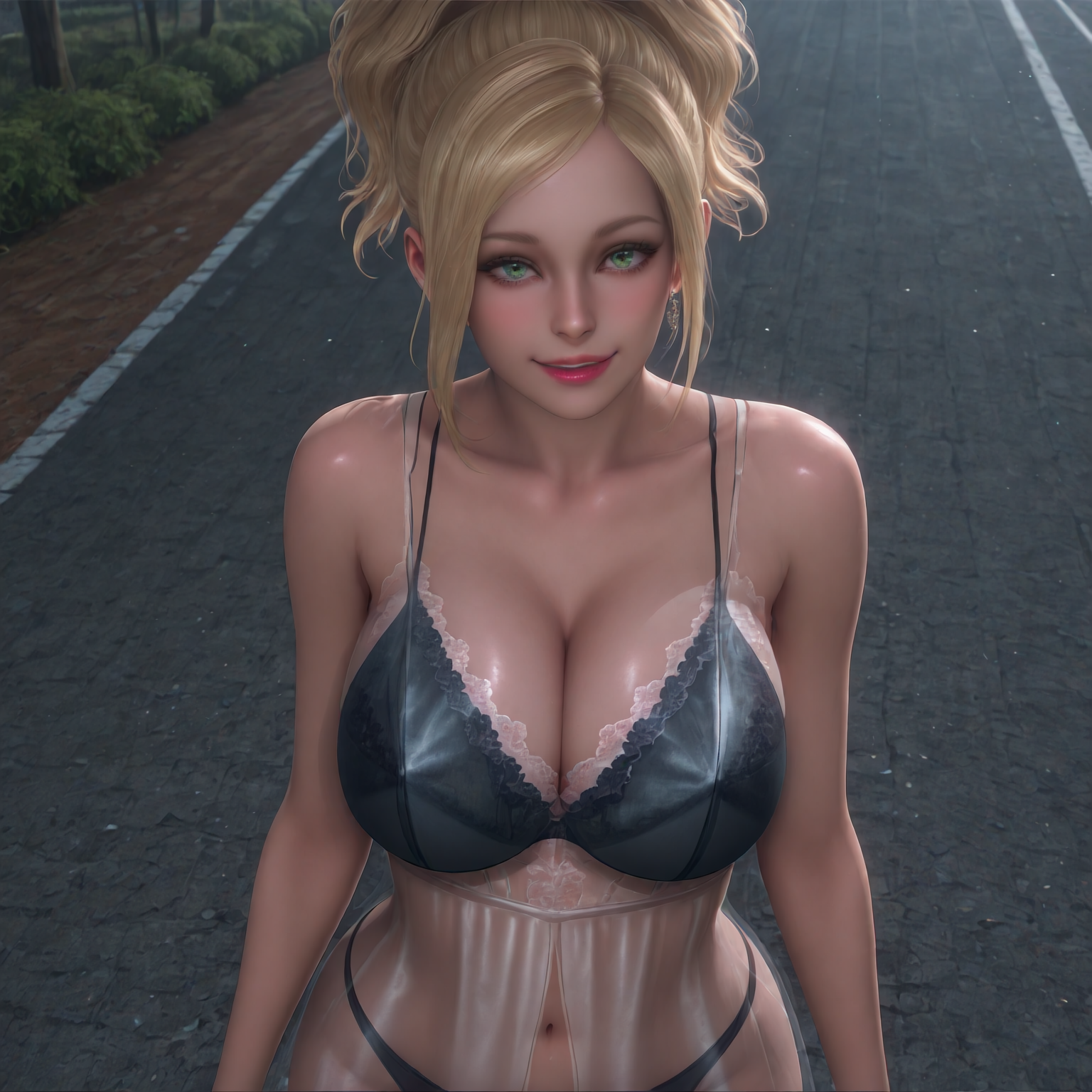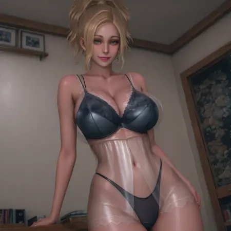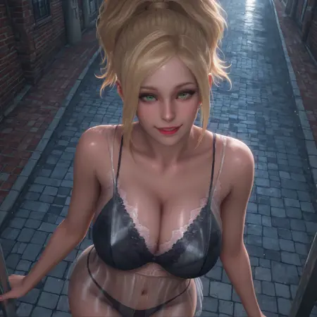 Penny01,1girl,solo,underwear,blonde hair,bra,lingerie,black bra,panties,black panties,navel,green eyes,earrings,jewelry,see-through,makeup,lace,nose,lace trim,ponytail,high ponytail,highleg,underwear only,lipstick,highleg panties,mole under mouth
