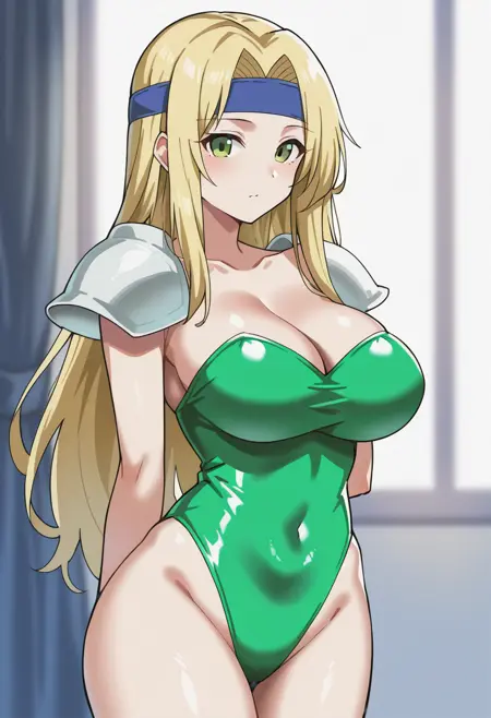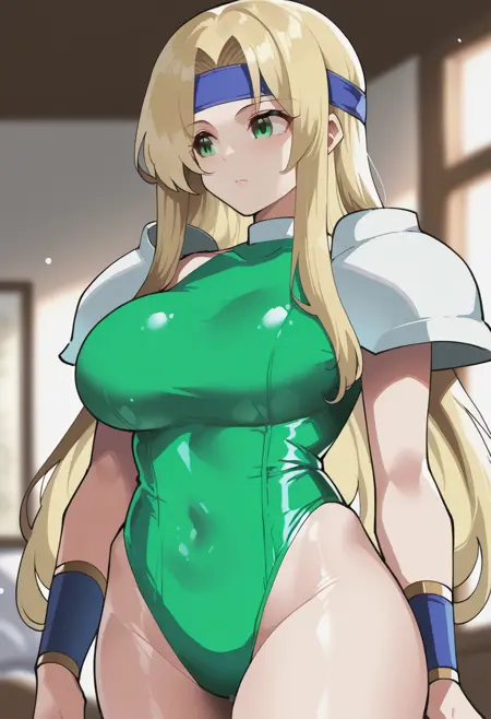celeschere, long hair, blonde hair female, large breasts, headband, green leotard, shoulder armor