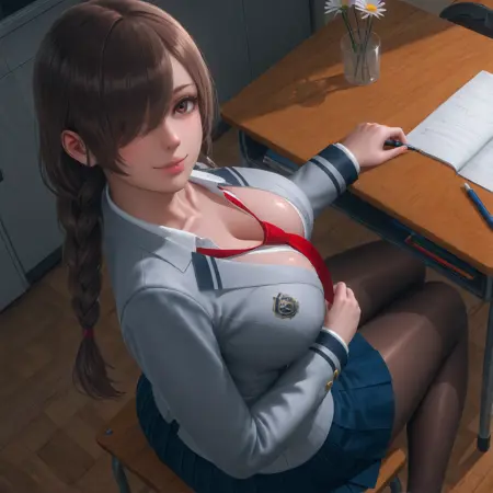 Dalia01,1girl,solo,necktie,brown hair,skirt,school uniform,flower,hair over one eye,brown eyes,pantyhose,red necktie,long hair,pleated skirt,blazer,jacket,blue skirt