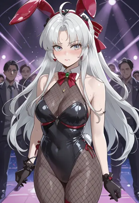 wwcrltt, white hair, long hair, parted bangs, grey eyes, very long hair, hair ornament, ahoge, bow, jewelry, hair bow, sidelocks, gradient eyes, hairband, multicolored eyes, red hairband, <lora:wuthering_waves_carlotta_illustrious:0.7>