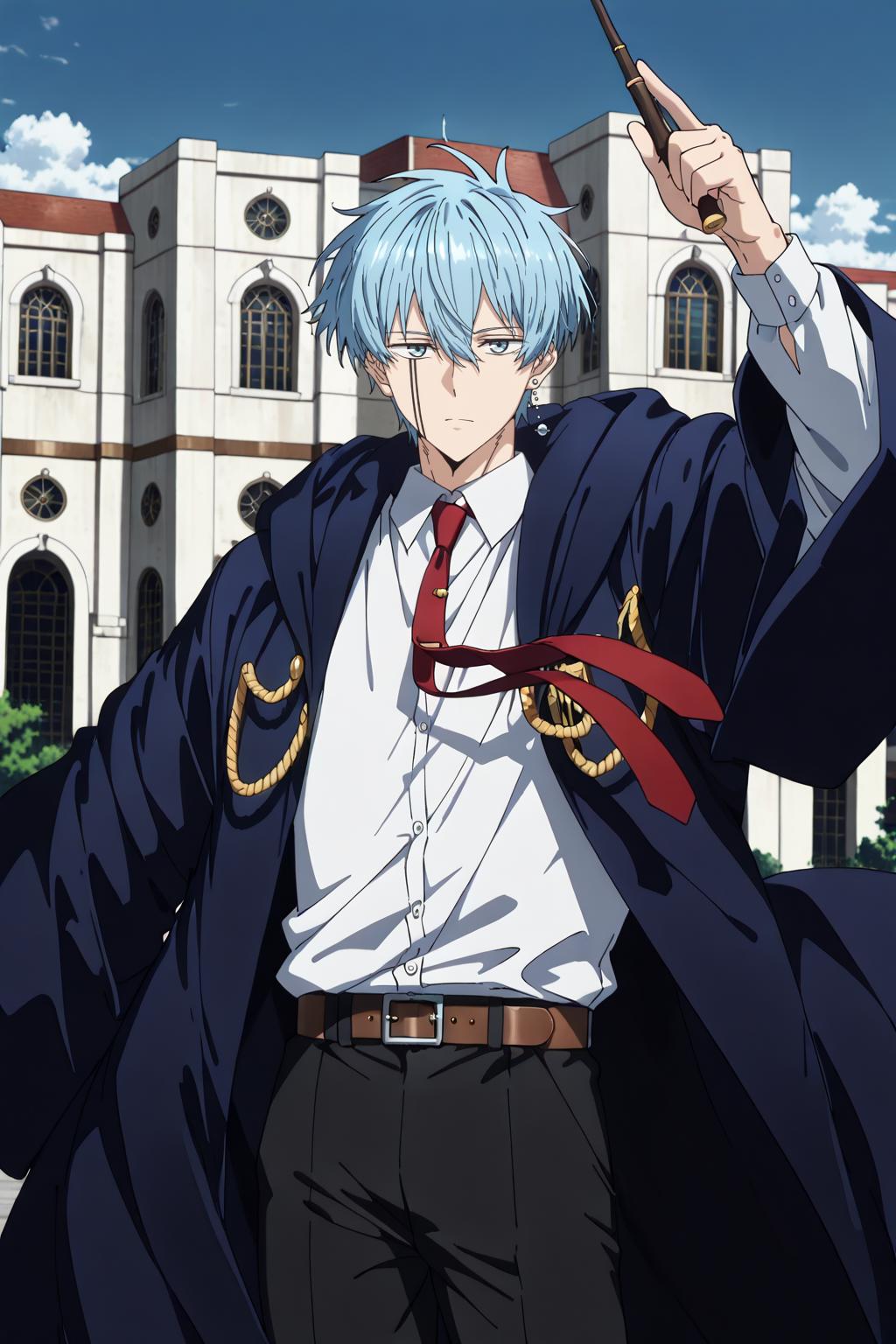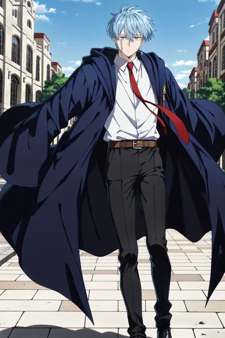 dark blue cloak, open cloak, hood down, red necktie, collared shirt, white shirt, brown belt, black pants, black shoes