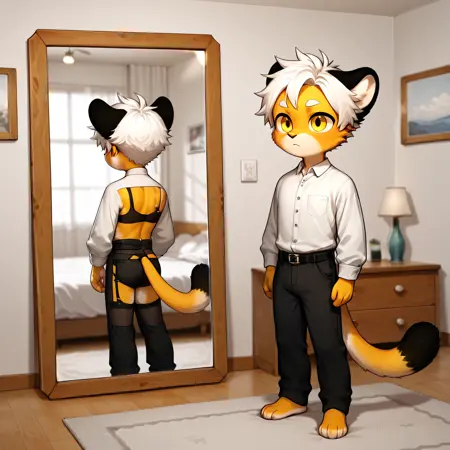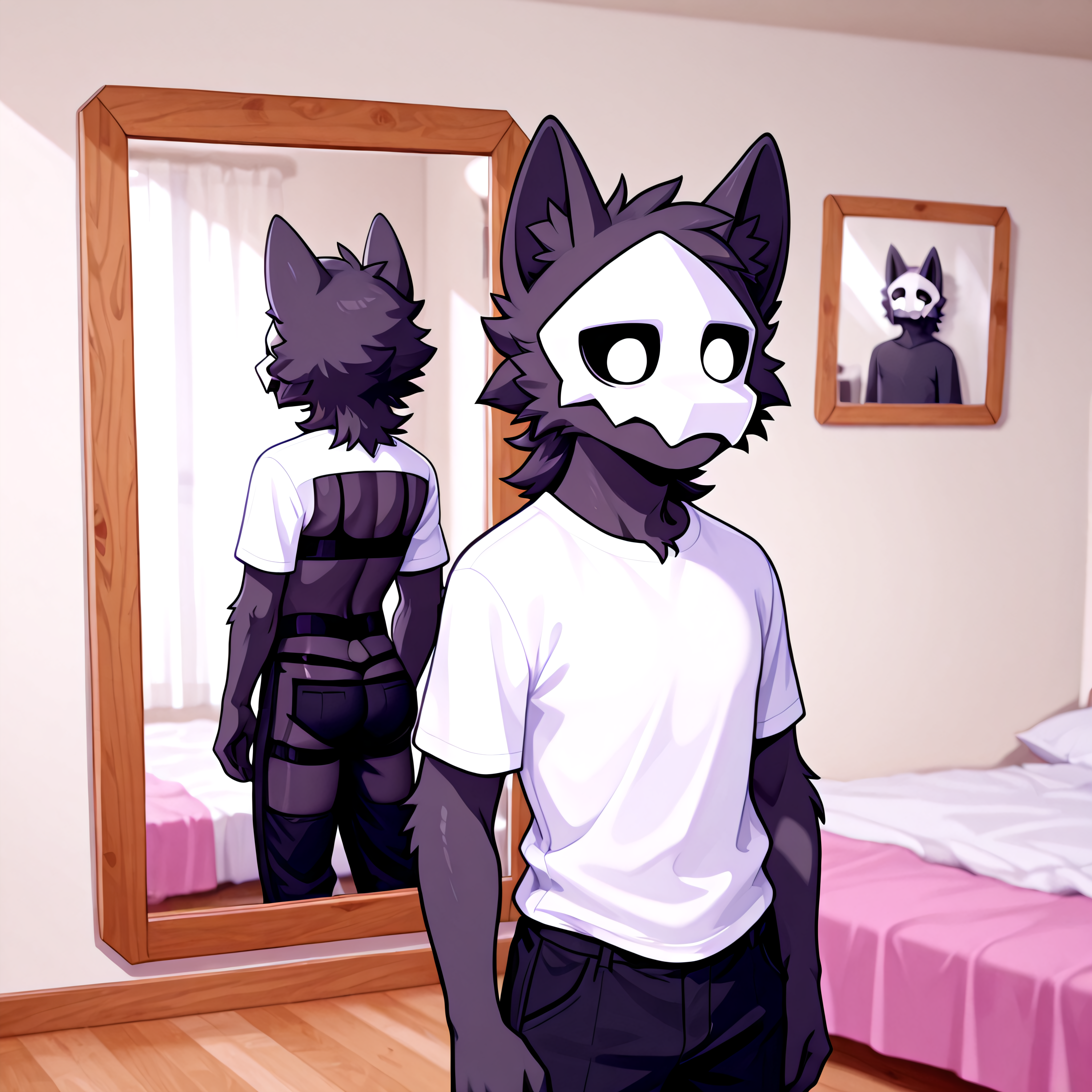mikus-concept, standing, mirror, front and back, front, back, white shirt, black pants,