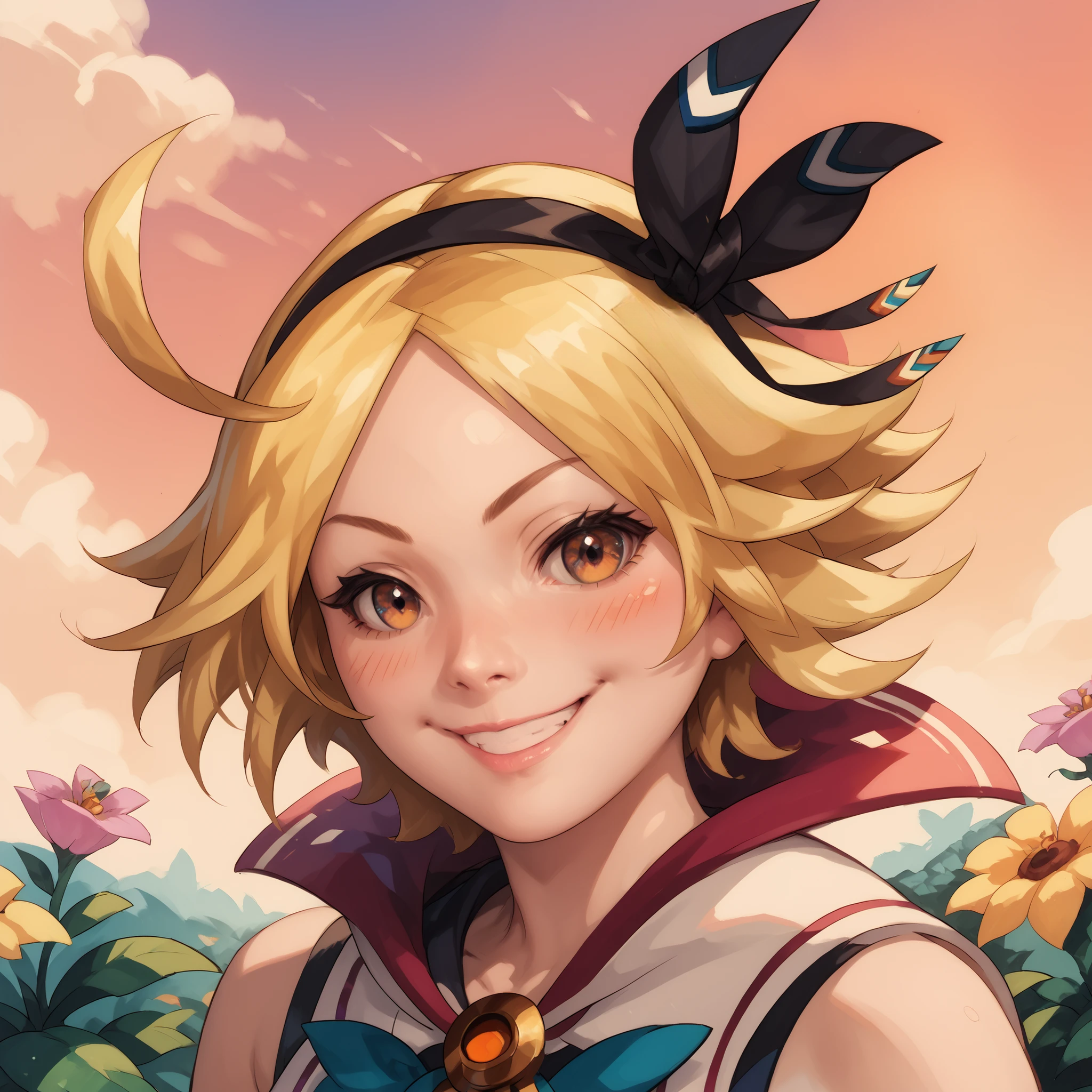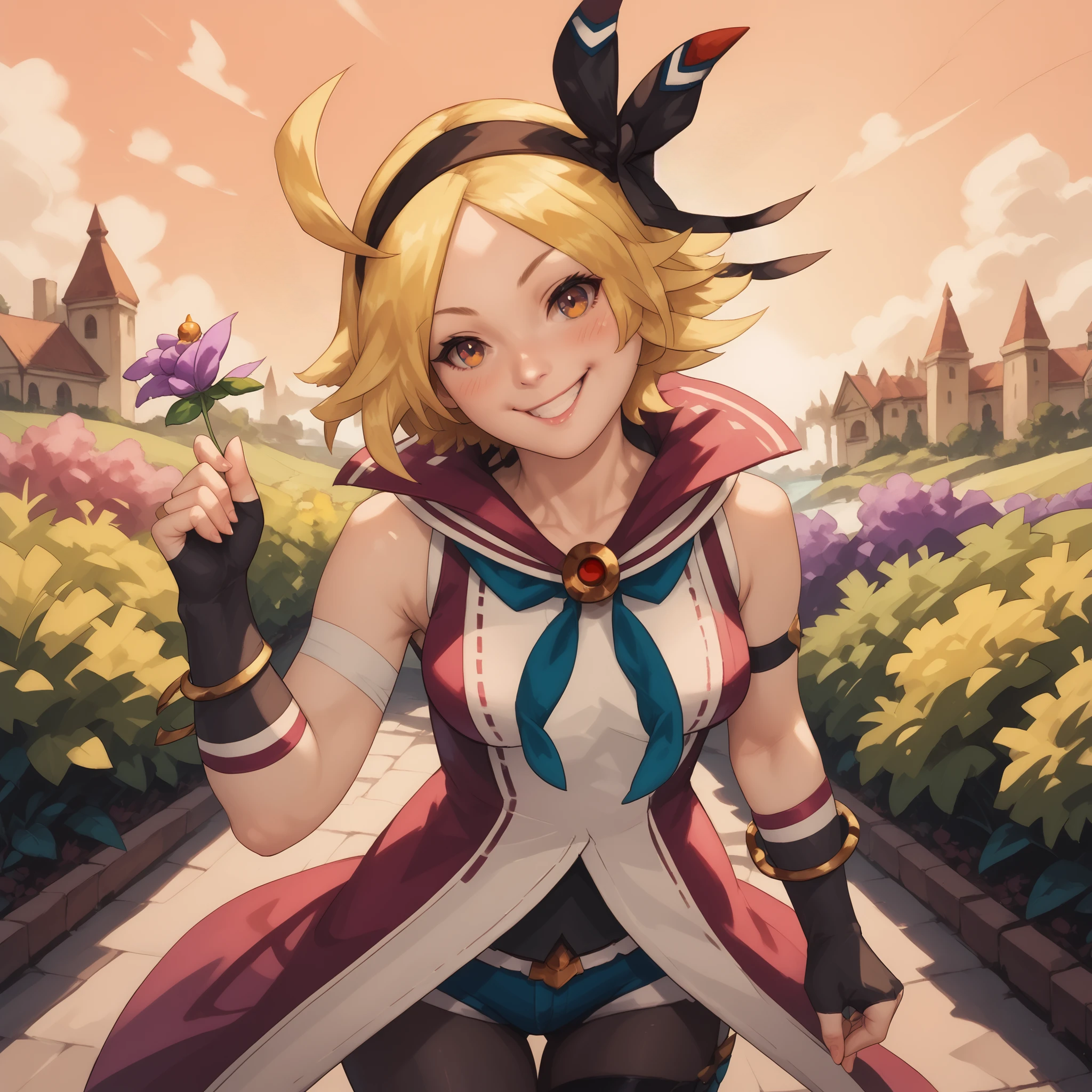 Trigger words: Vida Dragalia, blonde hair, short hair, hair ribbon, long jacket, elbow gloves, fingerless gloves, pantyhose, boots,