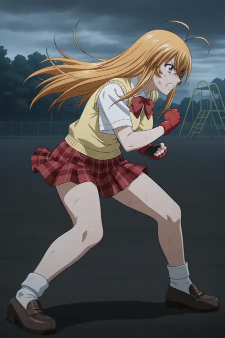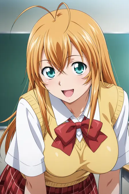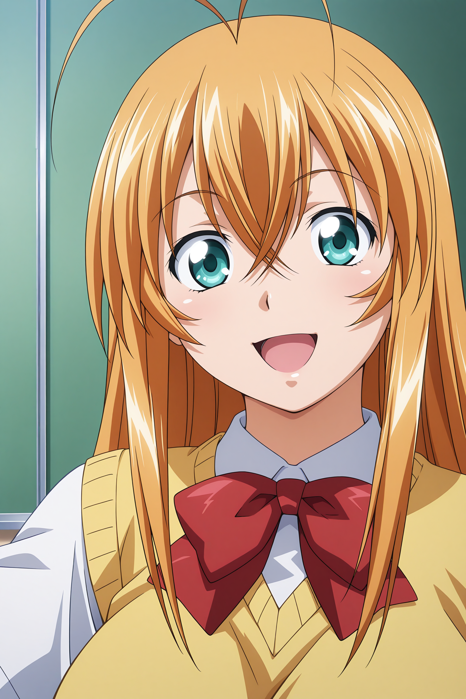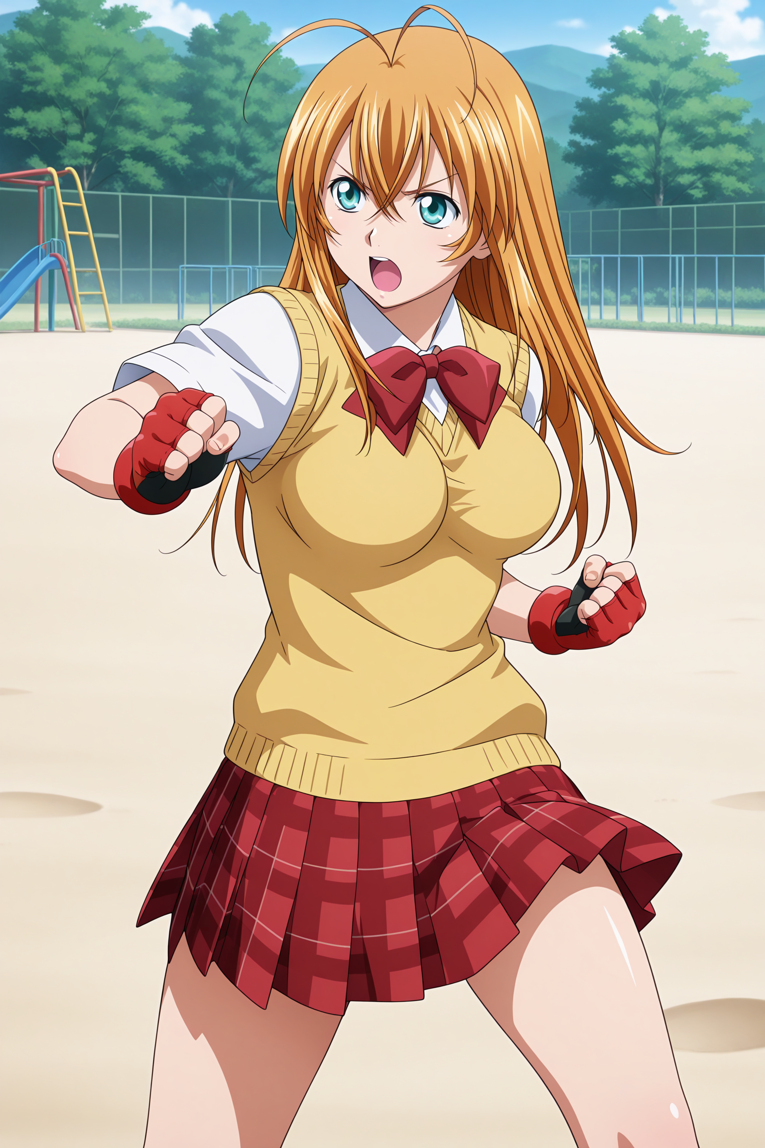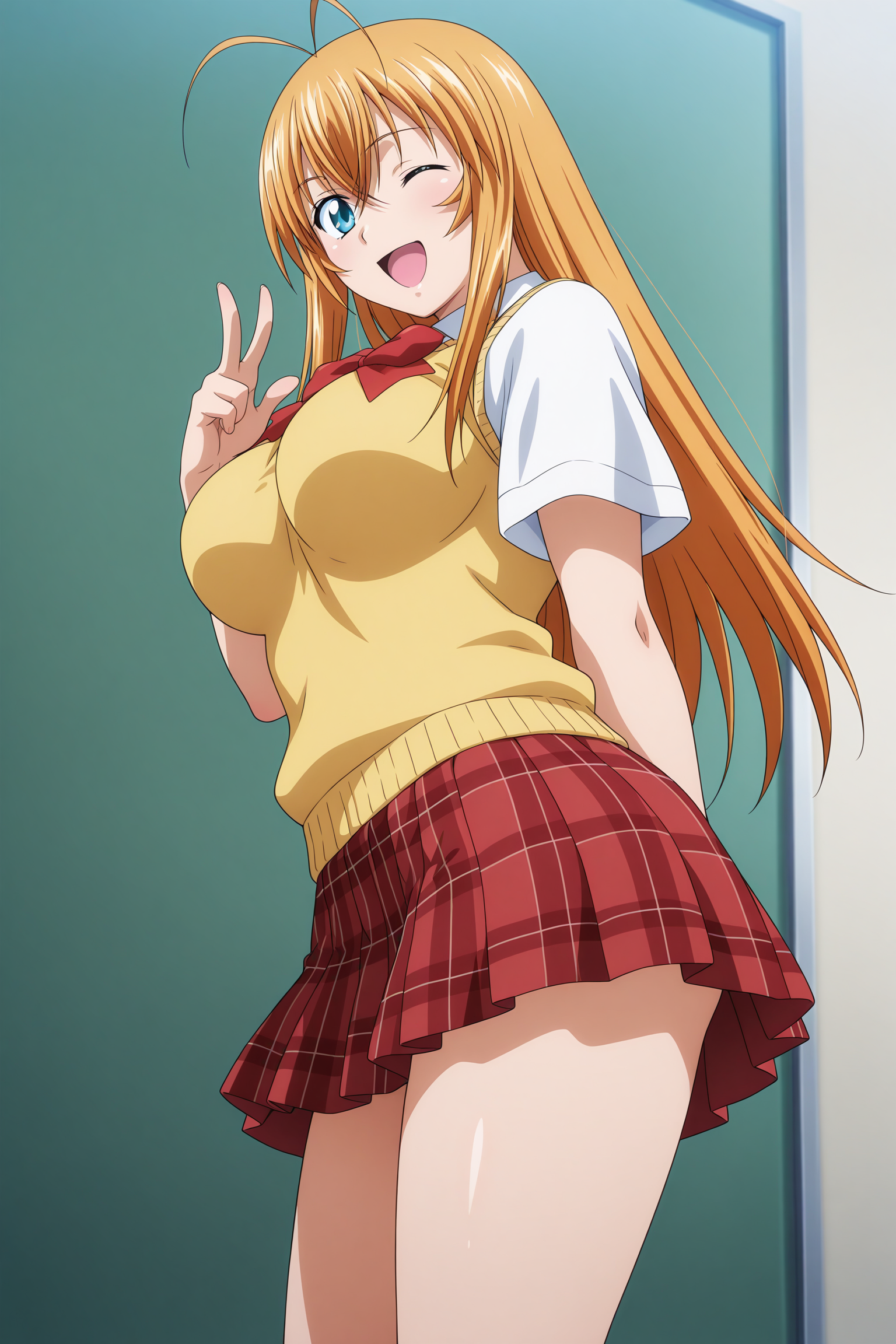 sonsaku hakufu, long hair, blonde hair, antenna hair, crossed bangs, sidelocks, aqua eyes, short sleeves, white shirt, collared shirt, red bowtie, yellow sweater vest, red skirt, plaid skirt, pleated skirt, white socks, ankle socks, brown footwear, loafers