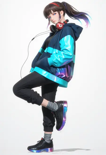 hairstyle: ponytail, blunt bangs, short sidelocks, red hairband,
