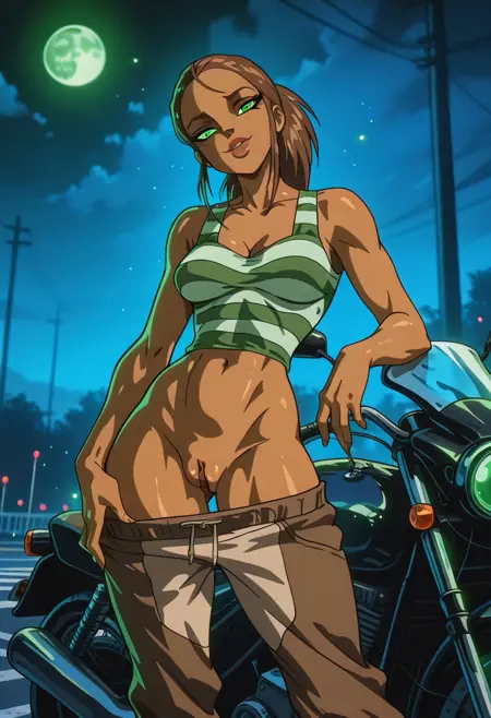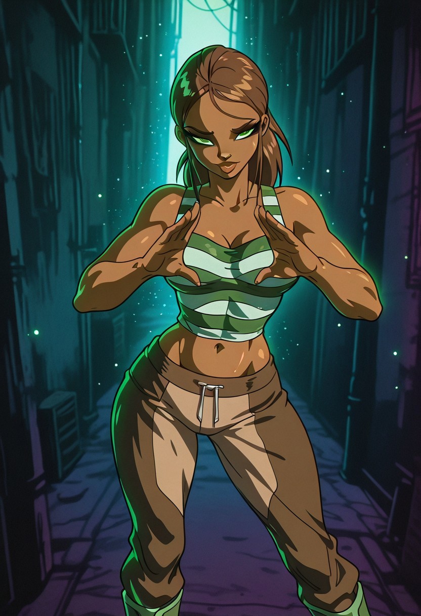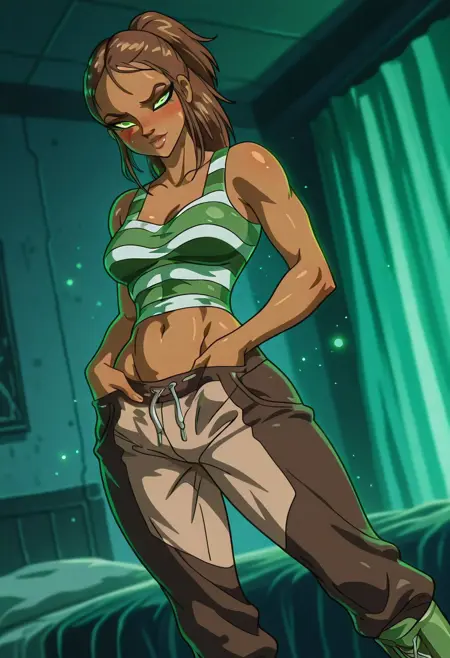CatalinaLeoneMS, 1girl, solo, dark skin, dark-skinned female, brown hair, long hair, ponytail, gold-green eyes, full lips, large breast, thick thighs, white and green striped top, cleavage, navel, midriff, groin, khaki coloured training pants, green and white boots,