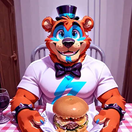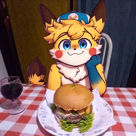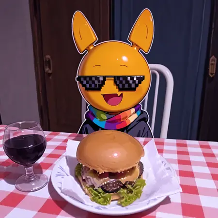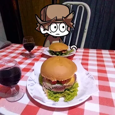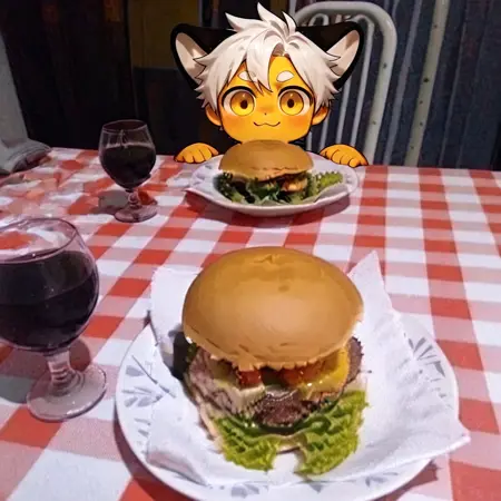 mikus-concept, dinner, burger, wine, table, upper body, chair