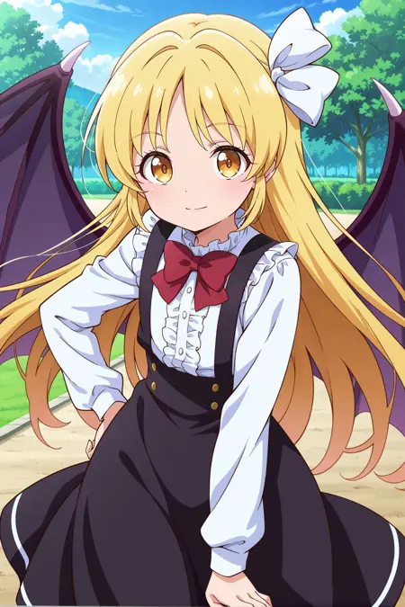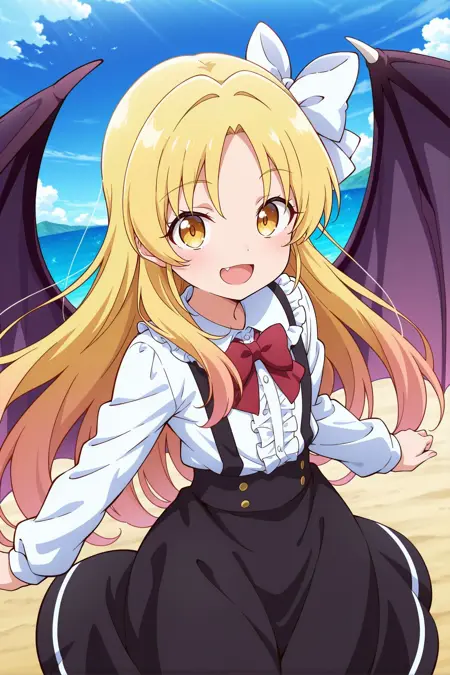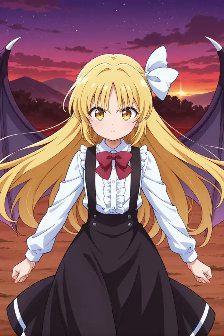 kurumi, 1girl, solo, yellow eyes, blonde hair, long hair, bat wings, purple wings,