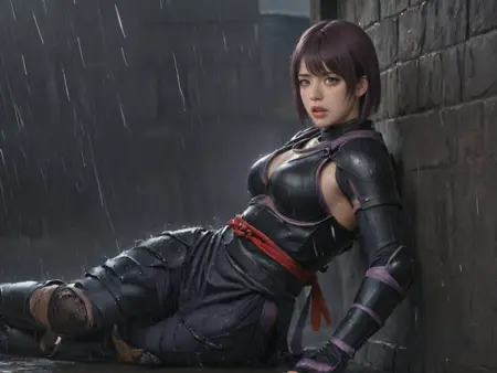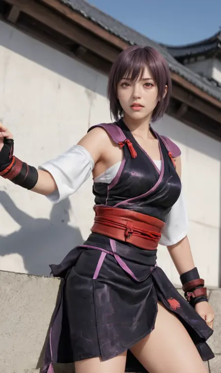 A female ninja, or kunoichi, with purple short hair.