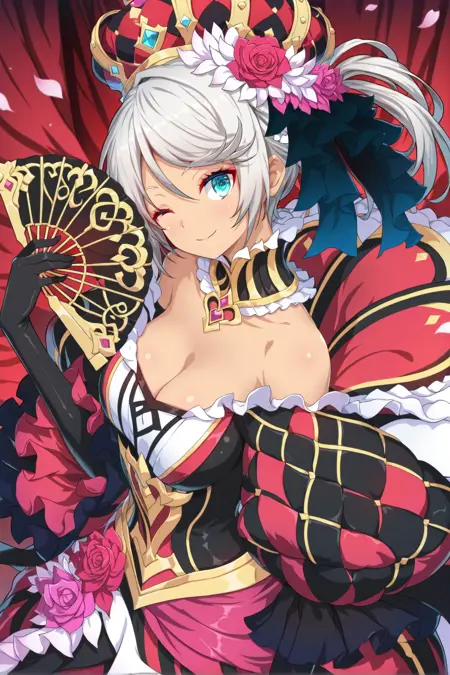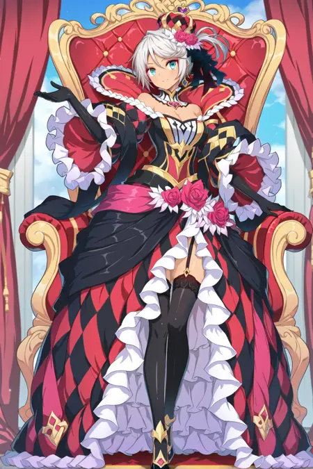 light brown skin, aqua eyes, silver hair, tied hair, hair ornament, crown, neck ruff, cleavage, bare shoulders, multicolored puffy long dress, black elbow gloves, black thighhigh, frill gown, garter belt, high heels