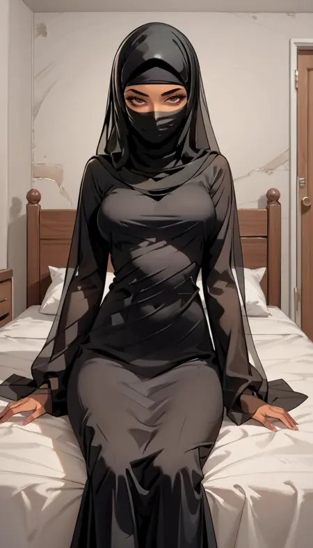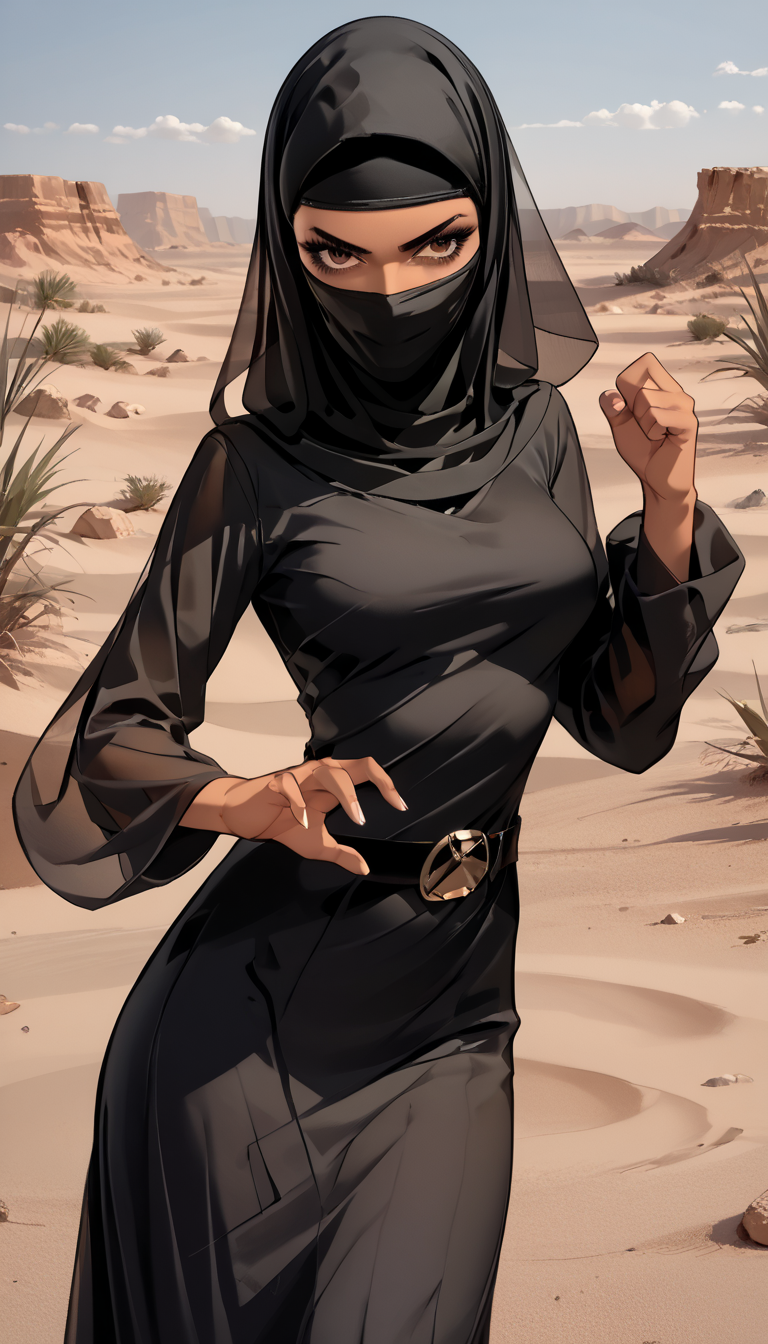 【Traditional Outfit Prompt】: Black Dress, Long Sleeves, belt, black hijab, veil, mask