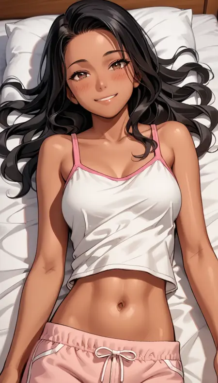 【Pajamas Outfit Prompt】: Black Hair, long hair, Pajama Top, midriff, Panjama Shorts