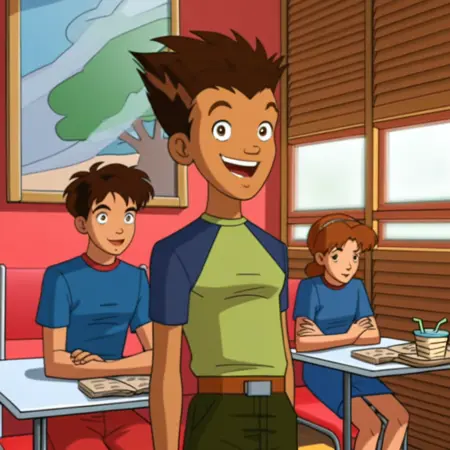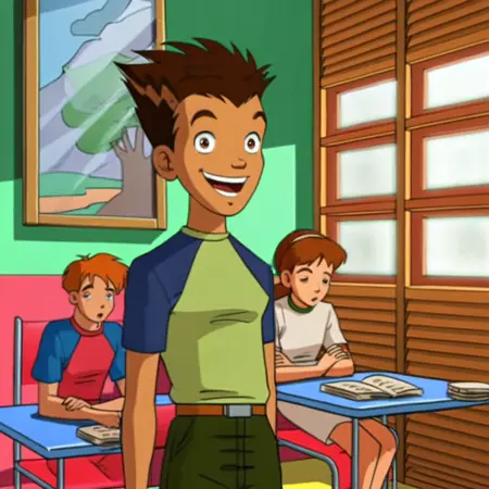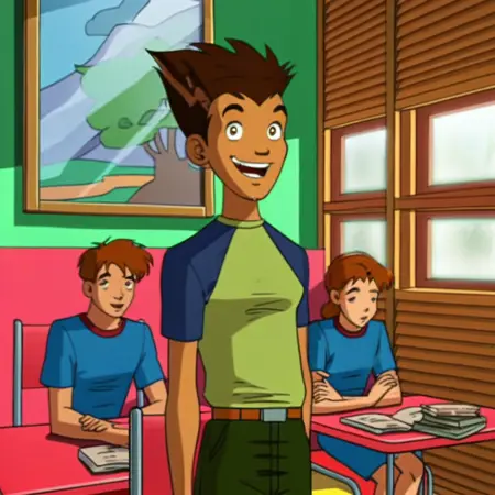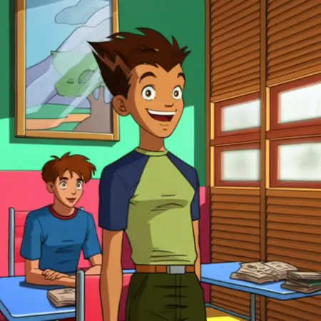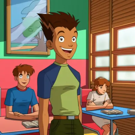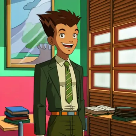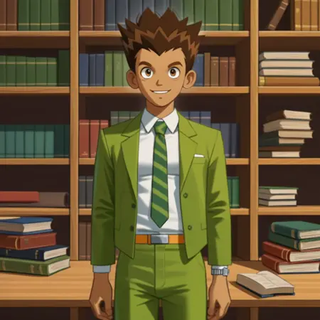 Green Shirt, Raglan Sleeves, Short Sleeves, T-Shirt, Shoes, Blue Sneakers, Dark Green Pants, Belt, Brown Belt