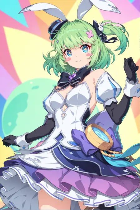blue eyes, cross in eyes, blush sticker, green hair, side short ponytail, animal ears attached to mini hat, hair ornament, bowtie, white dress, detached sleeves, white puffy sleeves, black elbow gloves, wrist cuffs, purple skirt, asymmetrical legwear, shoes