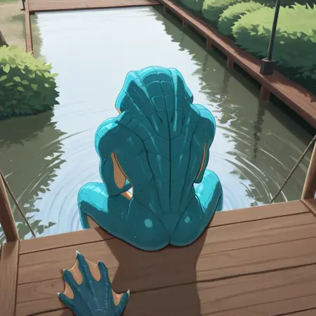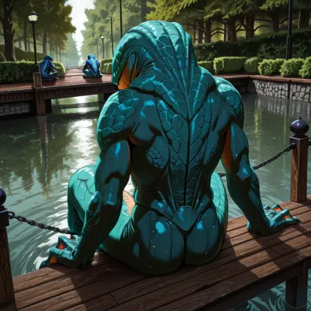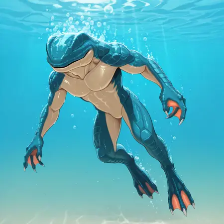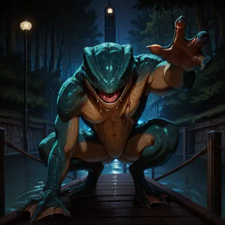 hg3og, hunter gamma (resident evil), frog monster, two-tone skin, eyeless, 1other, webbed hands, finger claws, webbed feet, toe claws, no teeth, claws, wet, scales