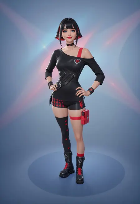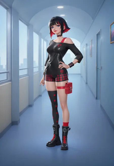 MorganaMyst, short hair, two-tone hair, black hair, bangs, blue eyes, red lips, choker, off-shoulder black shirt, shorts, thigh strap, single thighhigh, asymmetrical legwear, black boots,