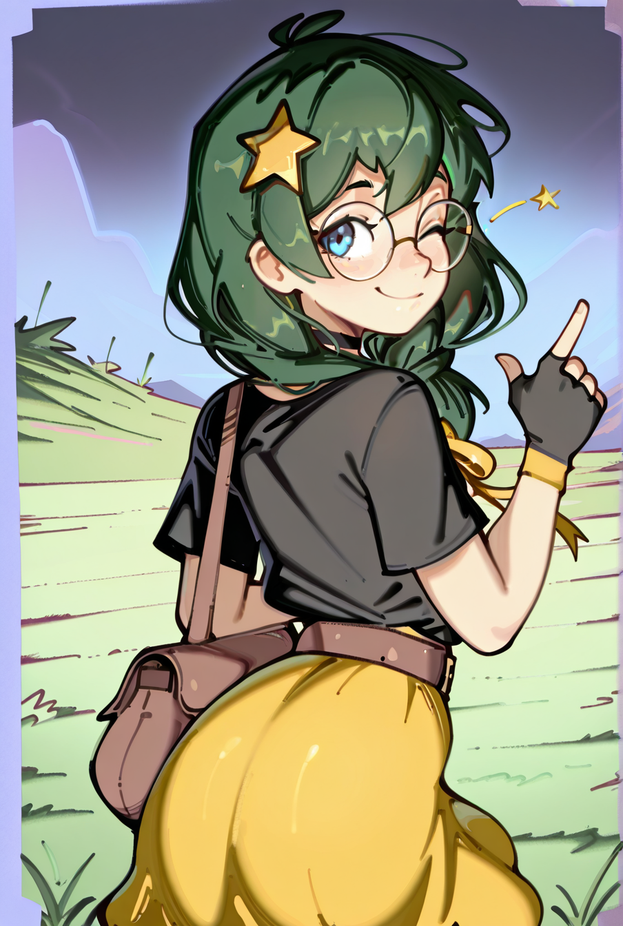 rivalivy, green hair, blue eyes, star hair ornament, glasses,