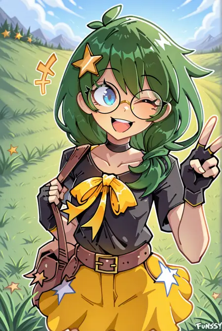 rivalivy, green hair, blue eyes, star hair ornament, glasses,