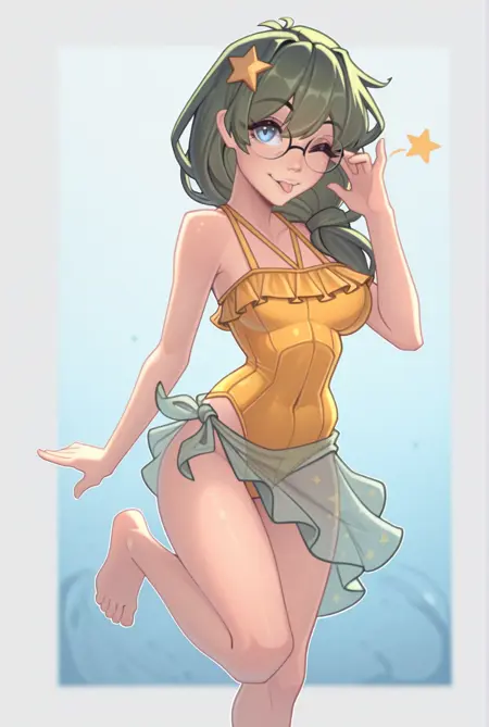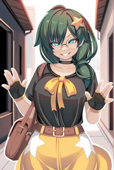 rivalivy, green hair, blue eyes, star hair ornament, glasses,