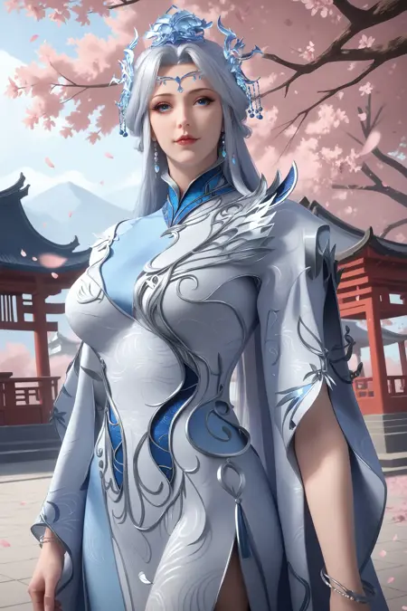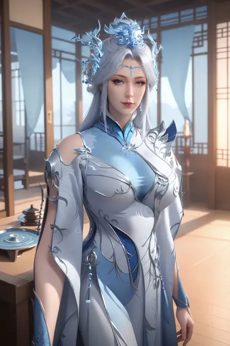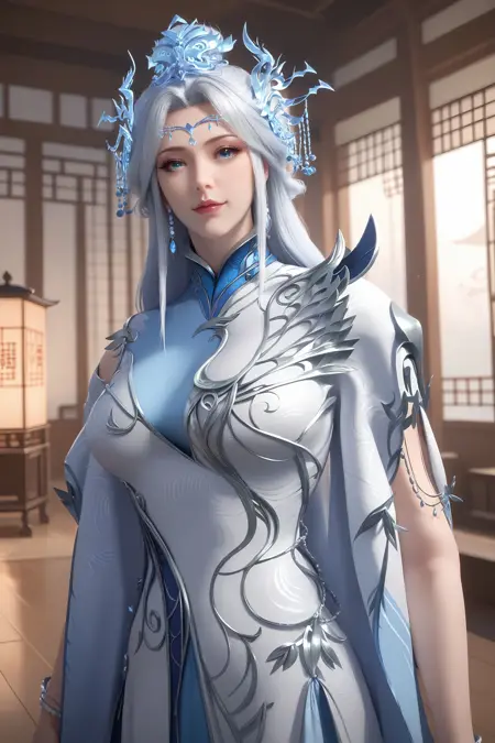 1girl, solo, dress, blue eyes, long hair, white dress, hair ornament, chinese clothes, white hair, blue dress,