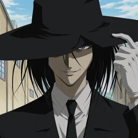 2000s (style), GetBackers_Style_Two, getbackers_for_akabane_kuroudo, 검정 머리, 보라색 눈, 악랄한 미소, 모자, 흰 장갑, 넥타이, 검정 코트, 검정 가죽 구두, 모자 끝을 만지는 동작