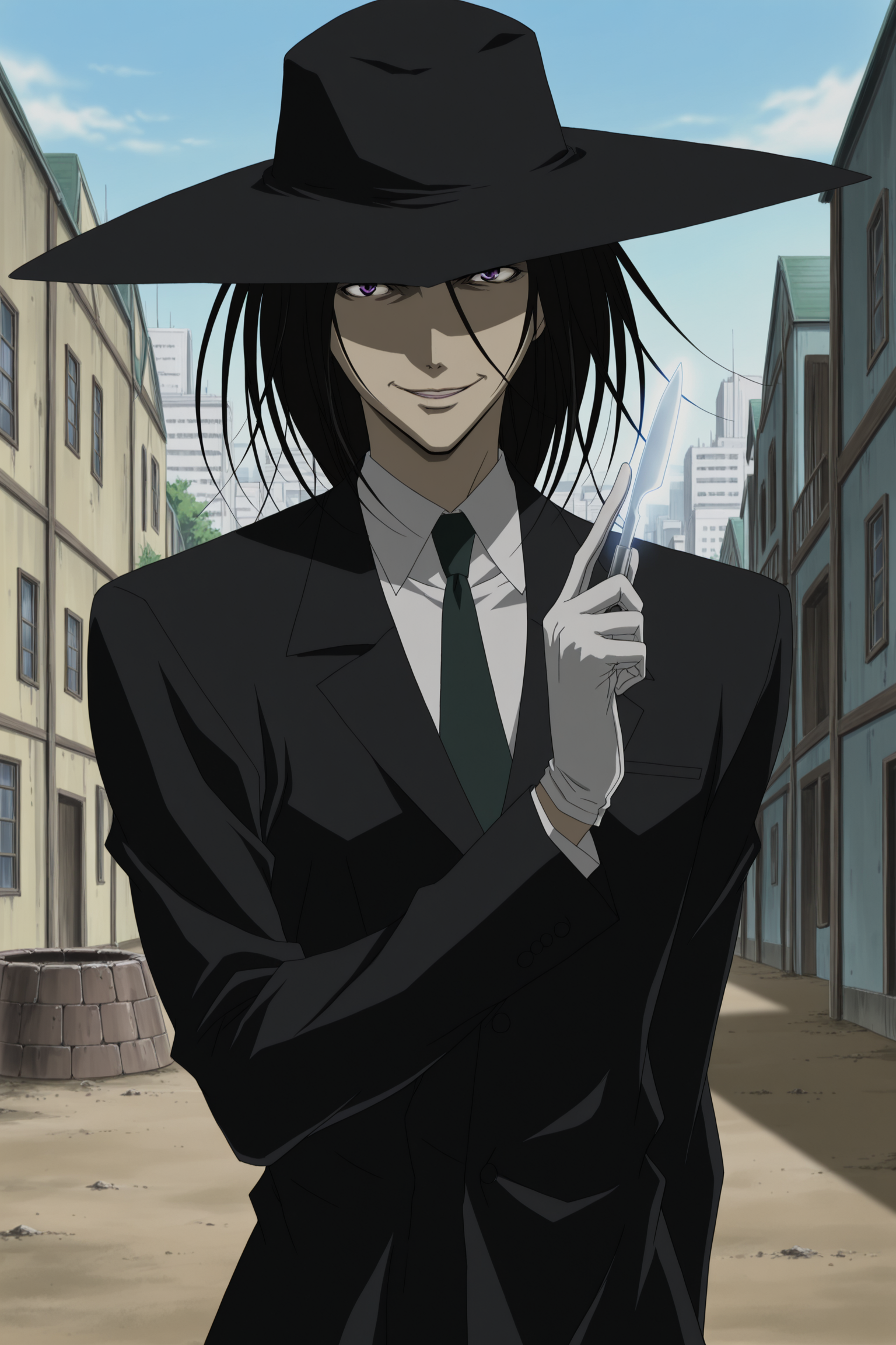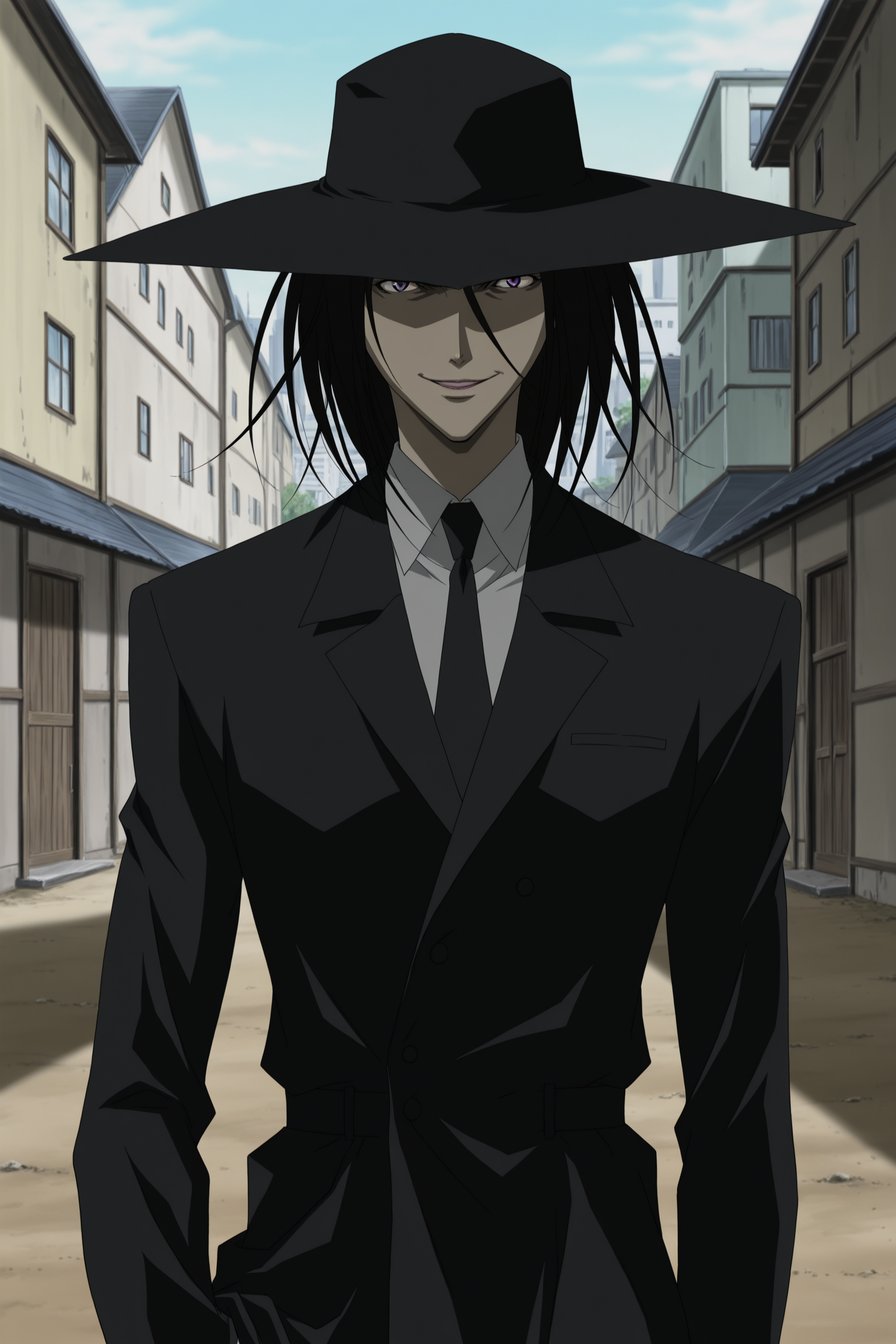 2000s (style), GetBackers_Style_Two, getbackers_for_akabane_kuroudo, 검정 머리, 보라색 눈, 악랄한 미소, 모자, 흰 장갑, 넥타이, 검정 코트, 검정 가죽 구두, 혈의 검