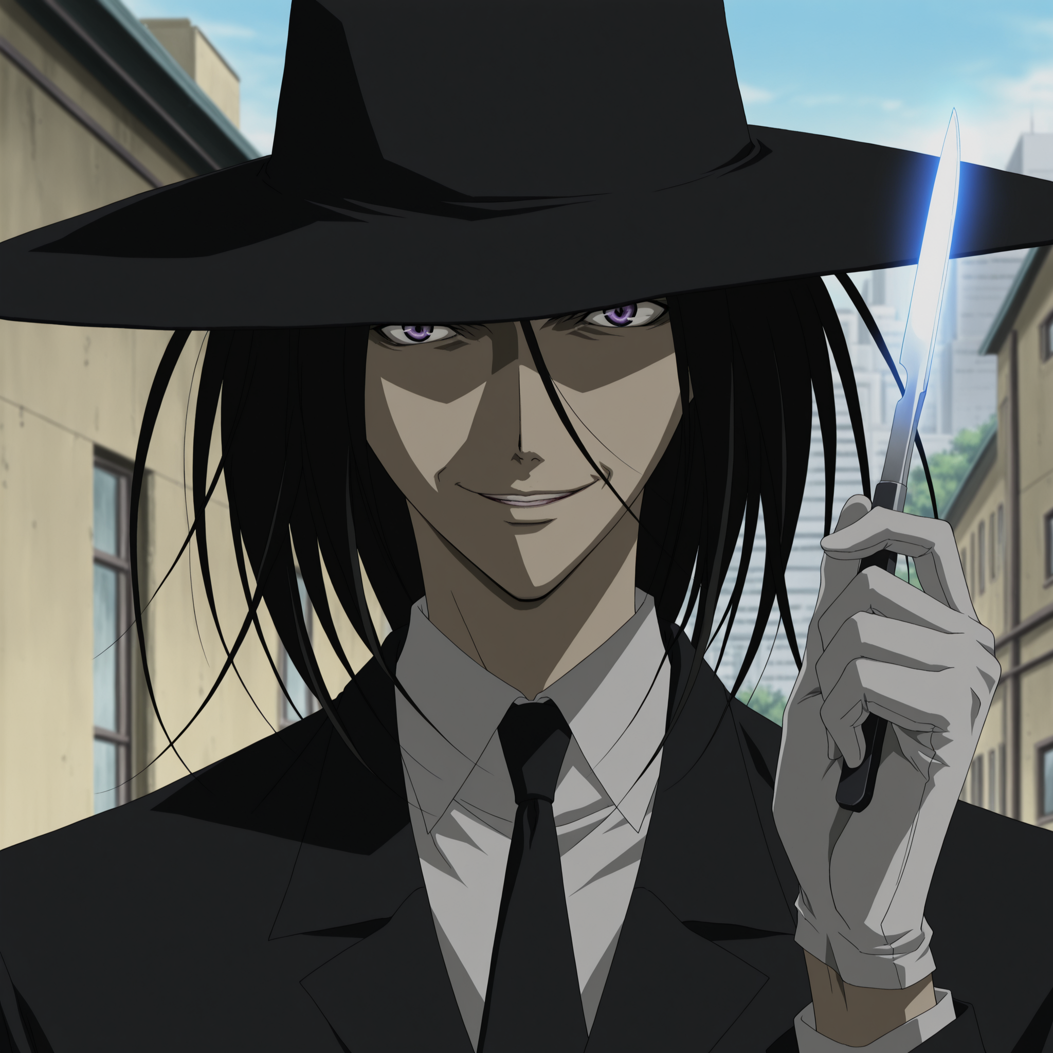 2000s (style), GetBackers_Style_Two, getbackers_for_akabane_kuroudo, 검정 머리, 보라색 눈, 악랄한 미소, 모자, 흰 장갑, 넥타이, 검정 코트, 검정 가죽 구두, 빛나는 외과용 수술도