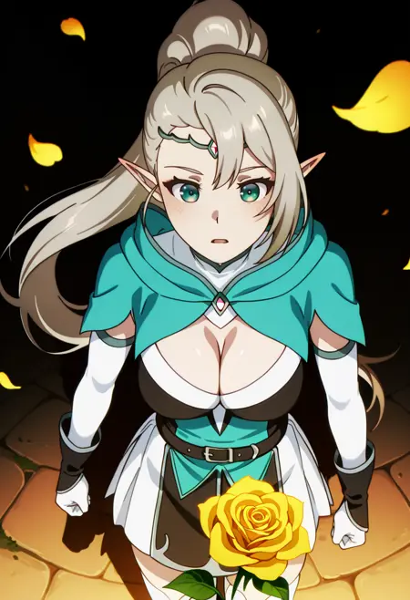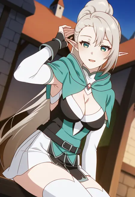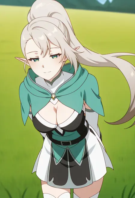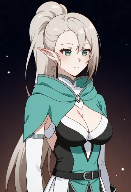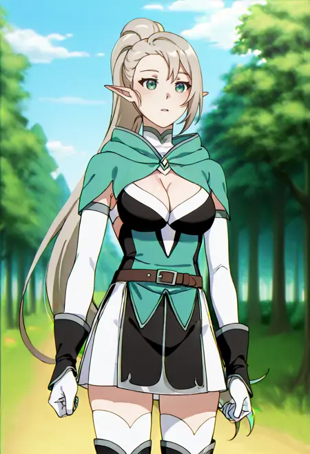 Selenev1m1,1girl,medium breasts,long white hair,high ponytail,green eyes,elf ears,green hooded cape,high neck,black and white top,front cutout,cleavage,belt,white skirt,black thigh-highs,armored gauntlets,open back