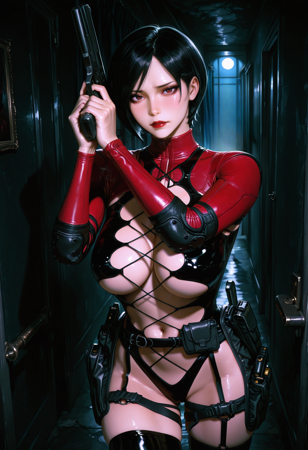 spclpsrs, red shrug (clothing), long sleeves, lingerie, cross-laced one-piece swimsuit, highleg swimsuit, revealing clothes, elbow pads, center opening, navel, underboob, garter belt, black belt, belt pouch, thigh holster, garter straps, black thighhighs, latex, large breasts, cowboy shot