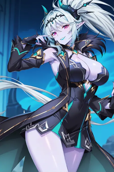 | トレーニングワード | purple eyes, pointy ears, colored skin, horns, circlet, hair ornament, long hair, silver hair, ponytail, big breasts, cleavage, black short dress, black sleeveless coat, detached sleeves, fingerless gloves, thigh, mismatch footwearコピーしました! |