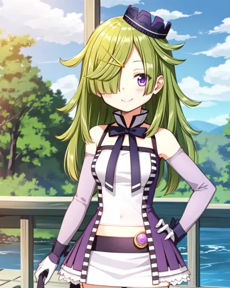 Appearance: green hair, blunt ends, one eye covered, purple eyes