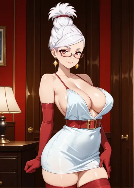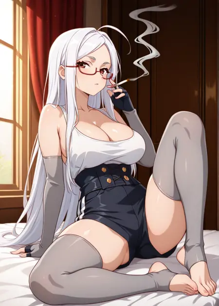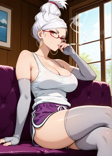 red ornament, large breasts, red glasses, dolphin shorts, purple shorts, short shorts, grey elbow gloves, fingerless gloves, grey thighhighs, white tank top, cleavage, mature female,