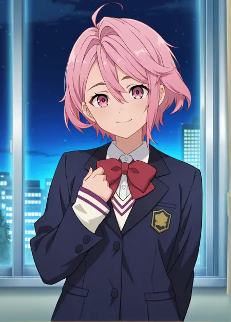 skirt, school uniform, red bow, jacket, White shirt, pleated skirt, bowtie, blazer, long sleeves, collared shirt, grey skirt, red bowtie, blue jacket,