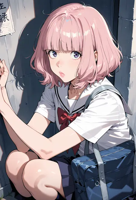 外观:1个女孩,粉发,短发,蓝眼,刘海,齐刘海,鲍勃头,紫眼,中长发,粉唇