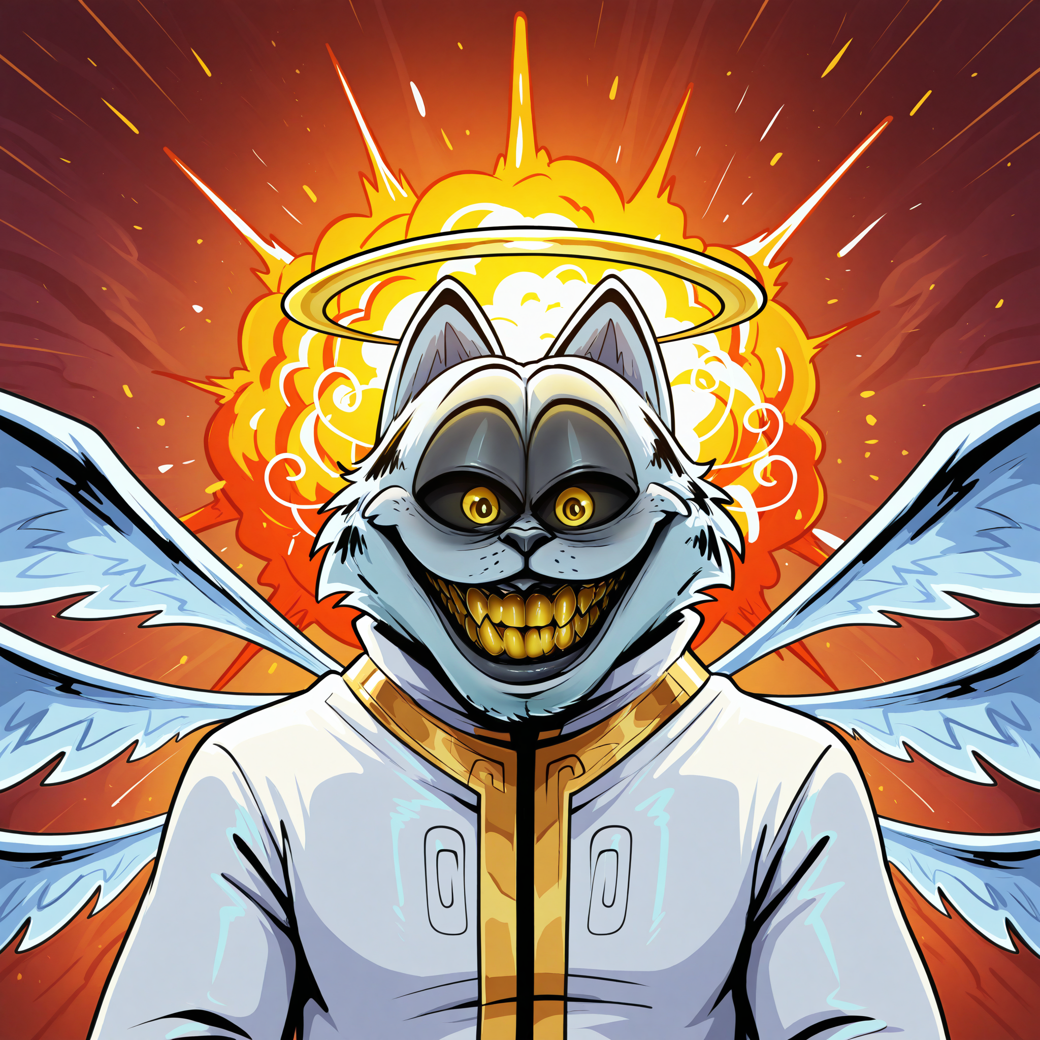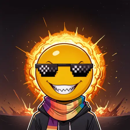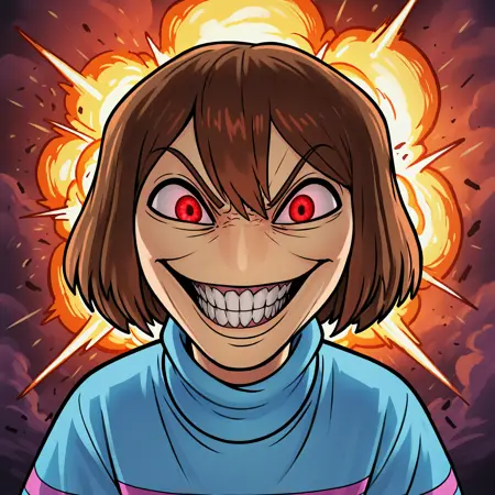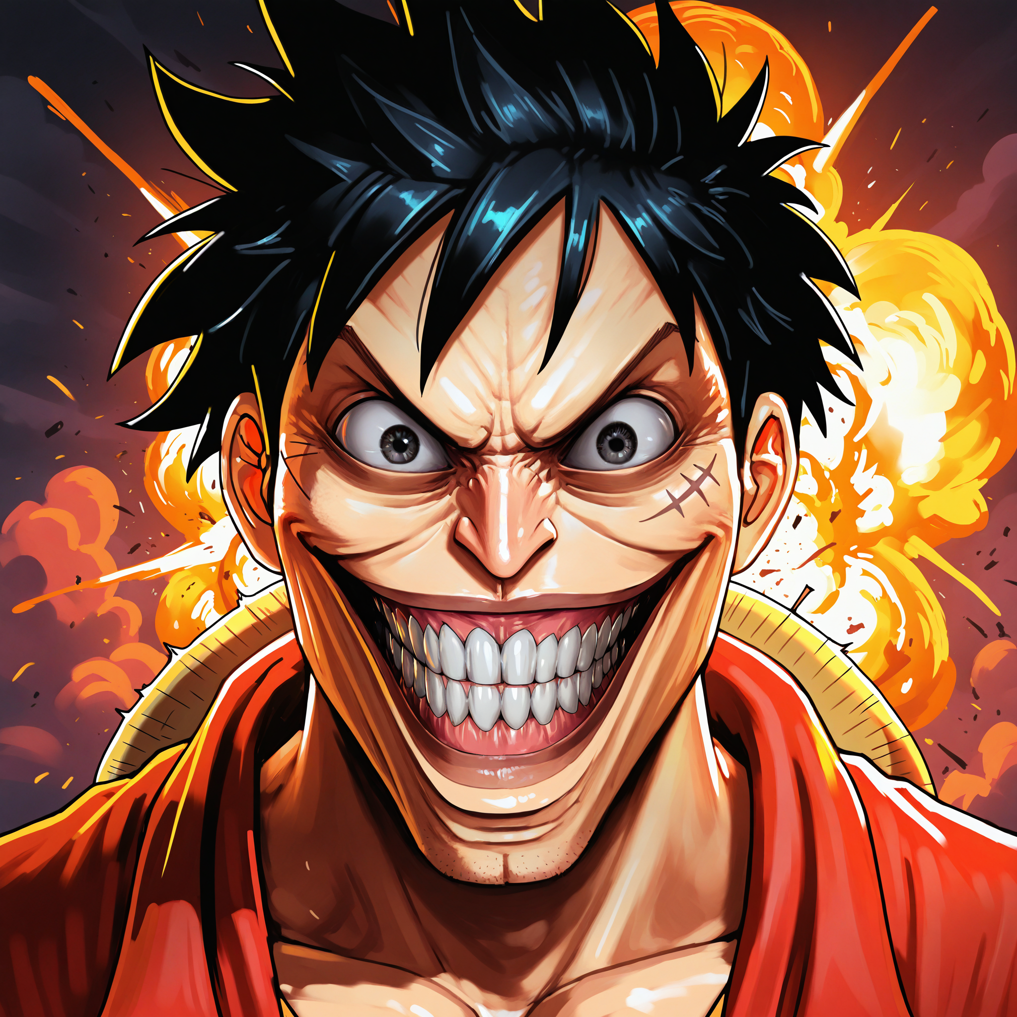 jonkler, looking at viewer, smile, grin, evil smile, teeth, explosion, explosion background