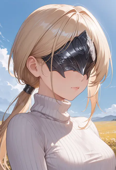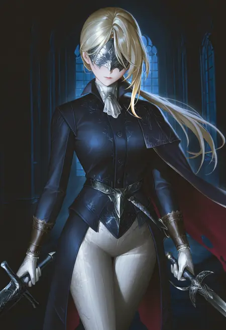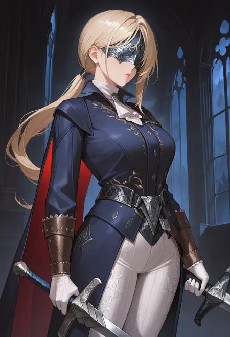 dchss, eye mask, covered eyes, blonde hair, long hair, ponytail, blue coat, white pants, white gloves, cape