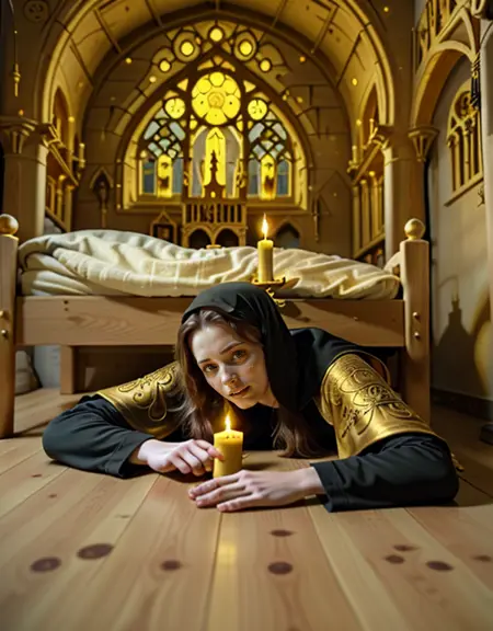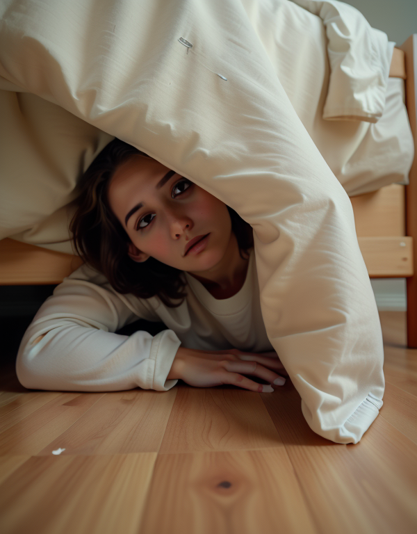 couple lying on the wooden floor with their bodies and heads under a wooden bed, while a cat is on the bed, closeup,