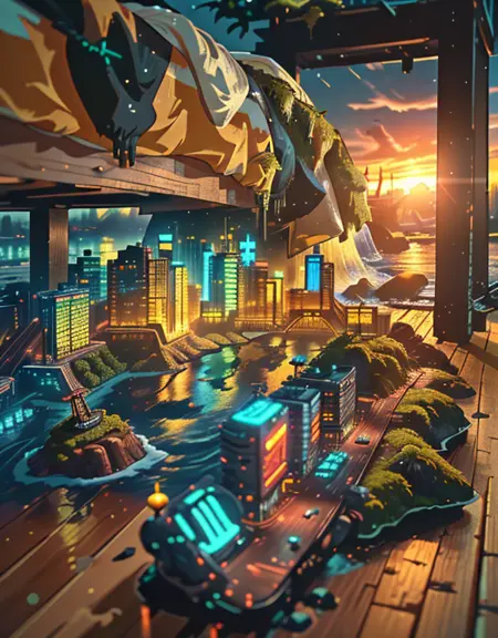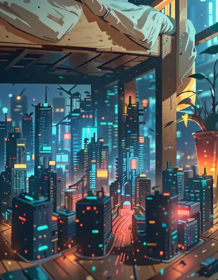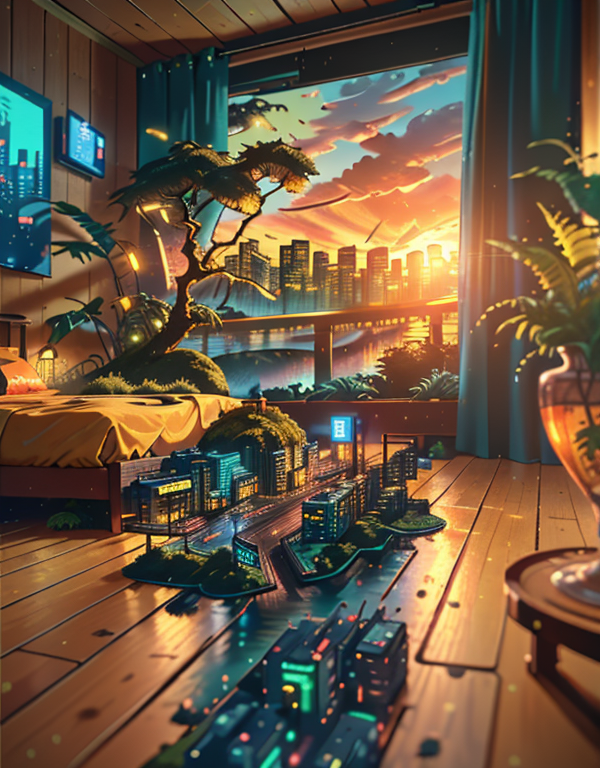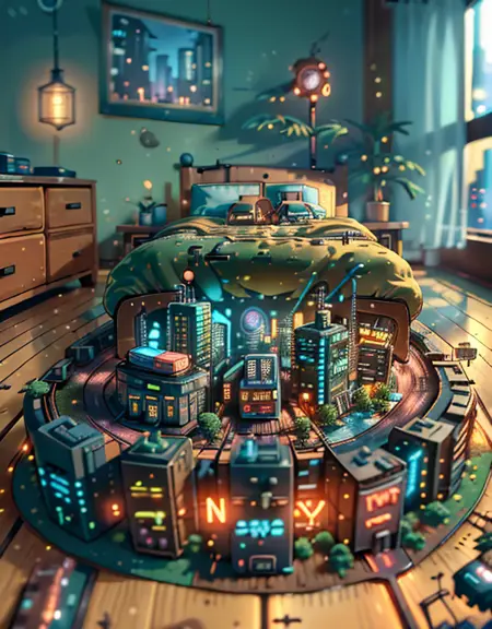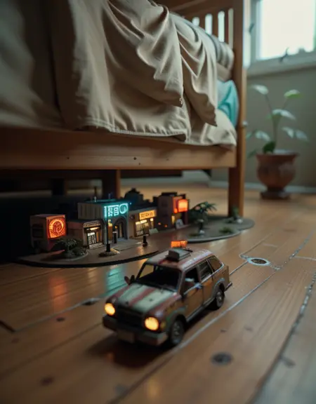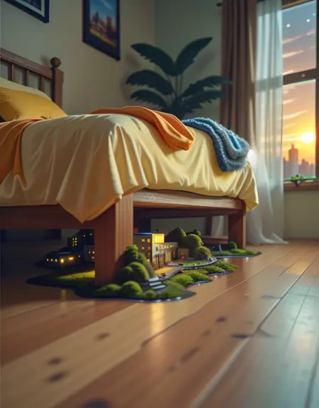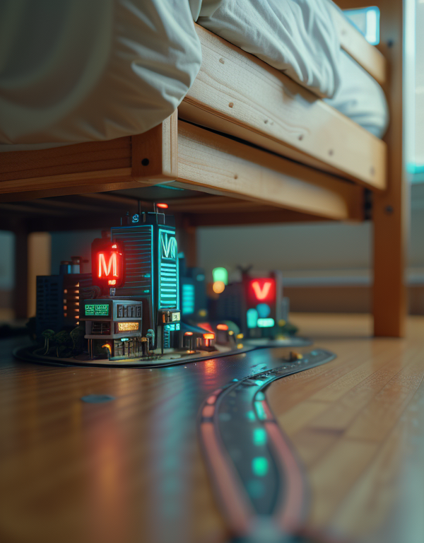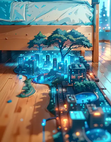 microscopic illuminated cyberpunk city with vegetation and streets on the wooden floor under a wooden bed, from side, closeup, bokeh