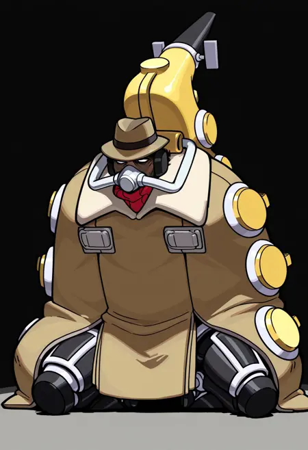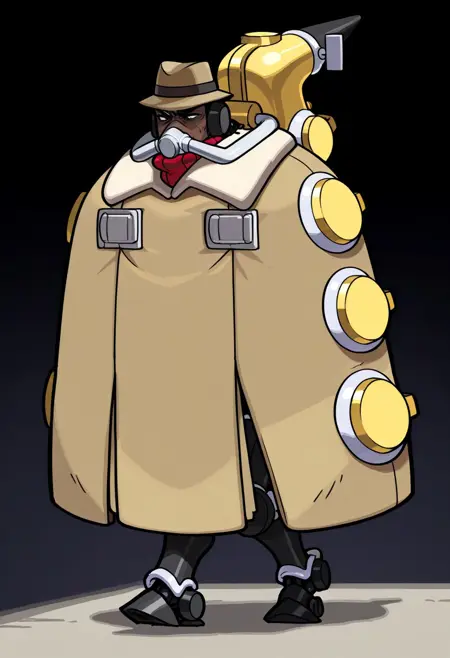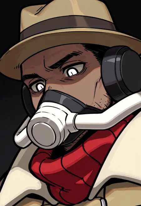 B1GB4ND, mature man, dark skin, facial hair, covered mouth, white eyes, white pupils, detective coat, black hair, gas mask, fedora, red ribbed scarf, headphones,