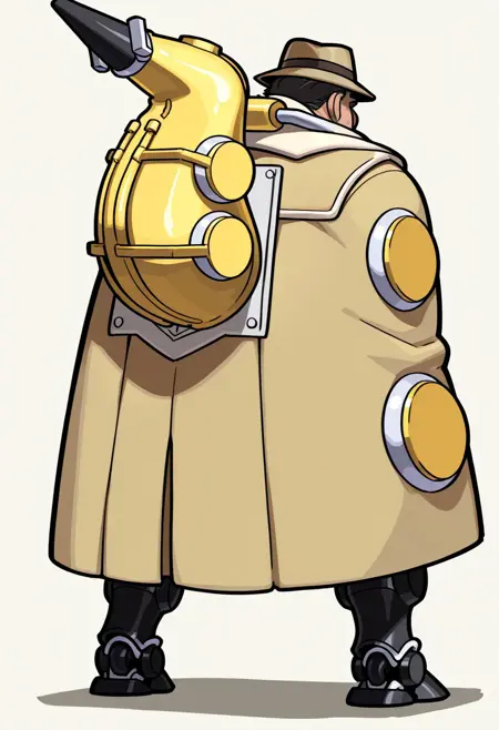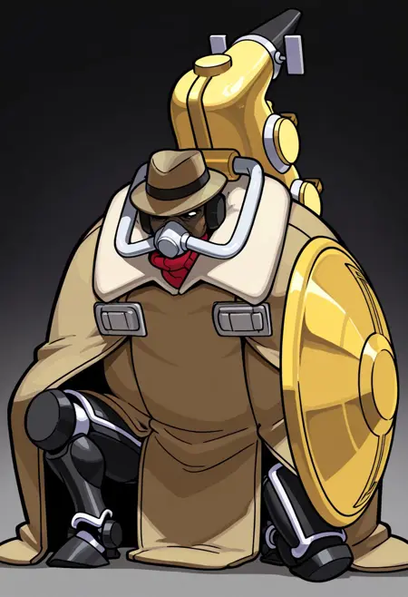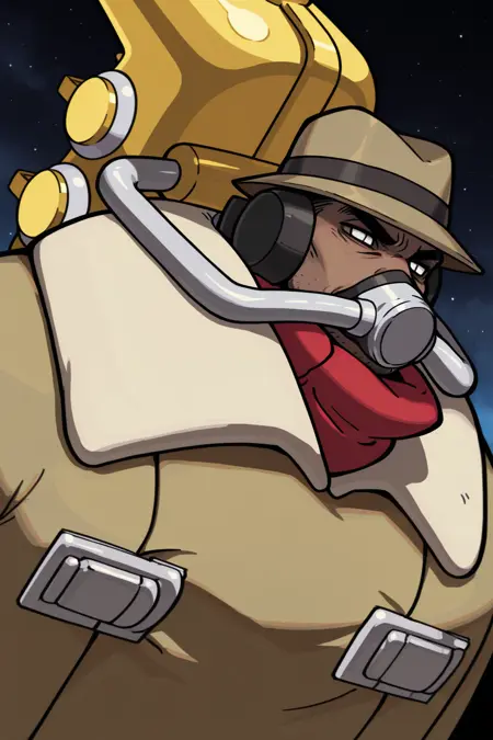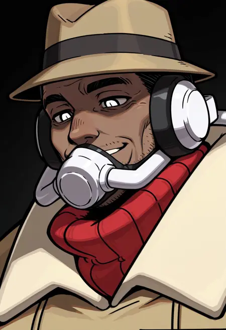 B1GB4ND、成熟した男性、黒い肌、顎ひげ、口を覆っている、白い目、白い瞳孔、探偵コート、黒髪、ガスマスク、フェドラハット、赤いリブ編みのスカーフ、ヘッドホン、